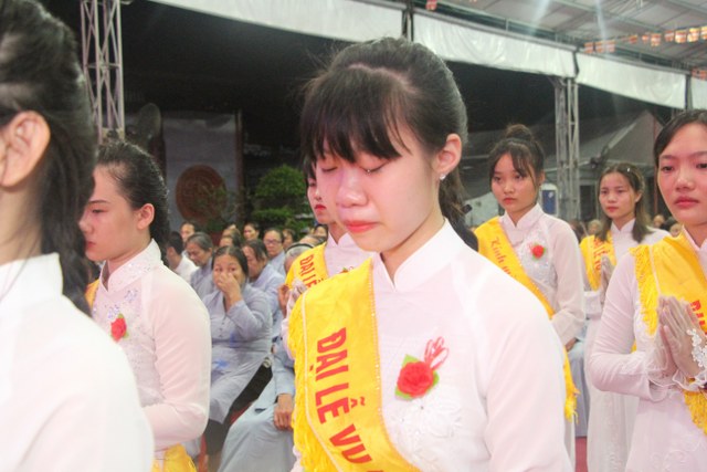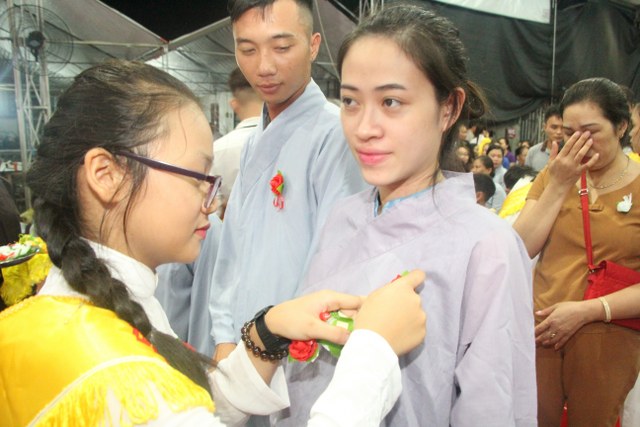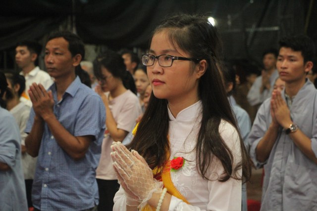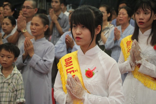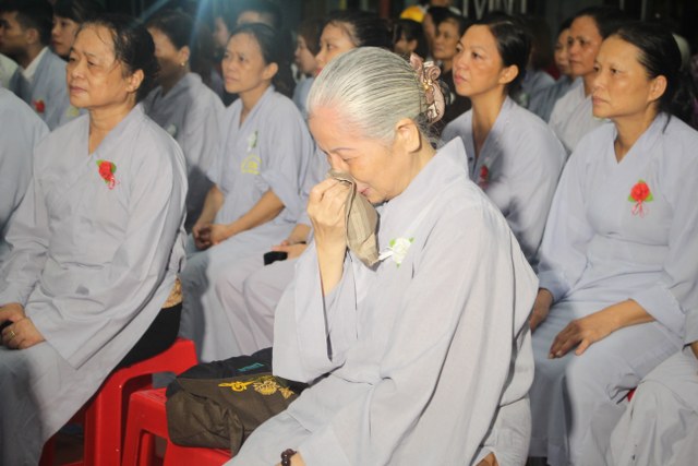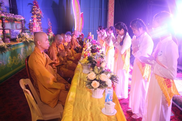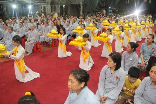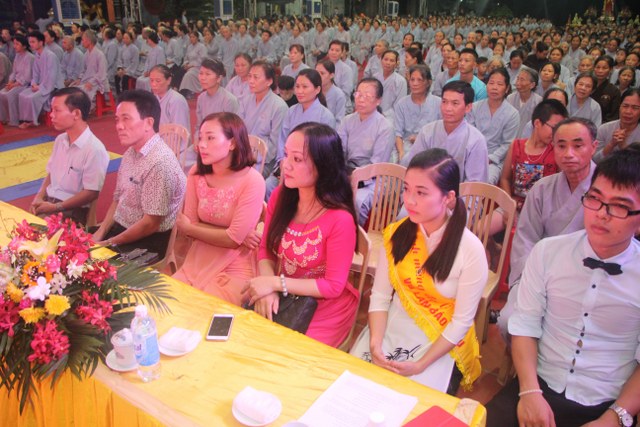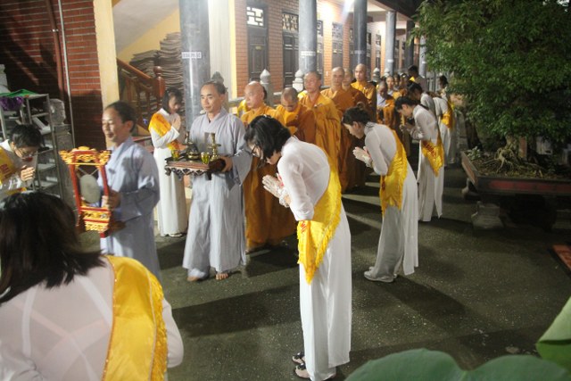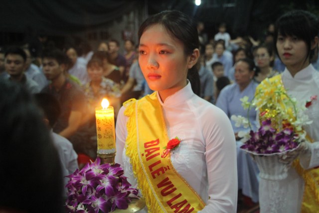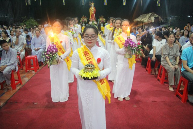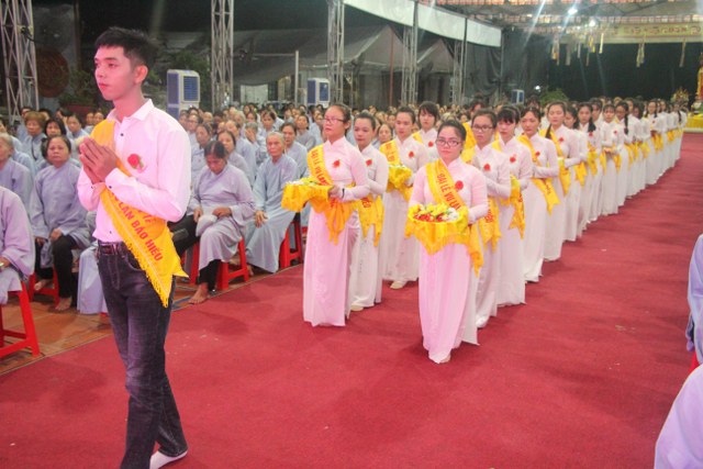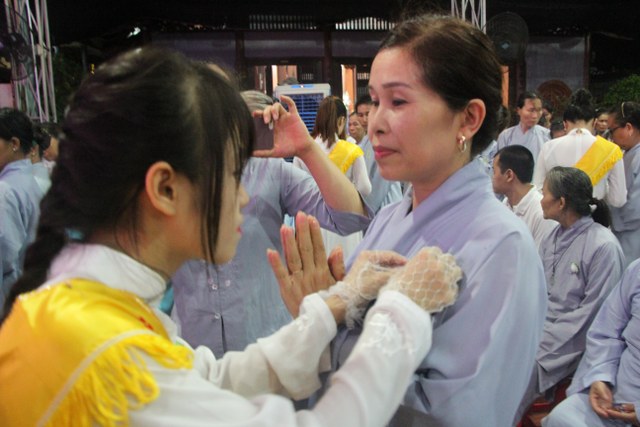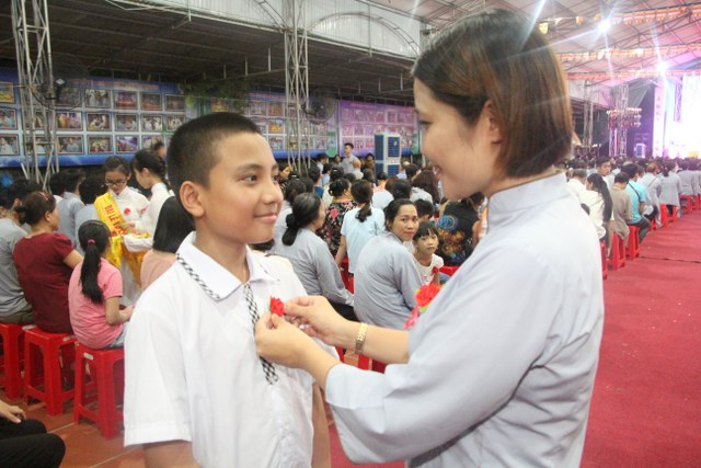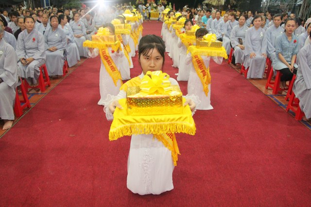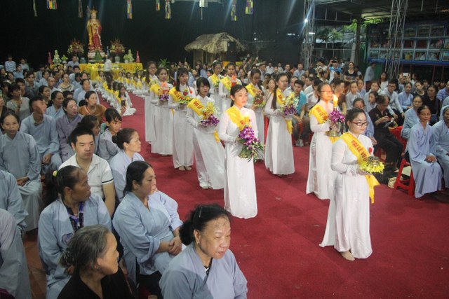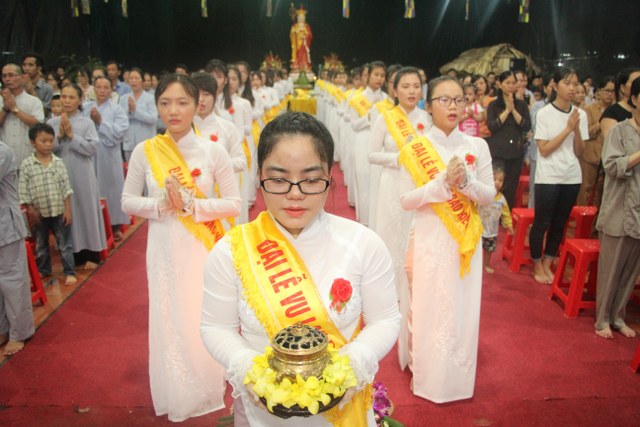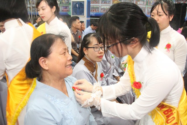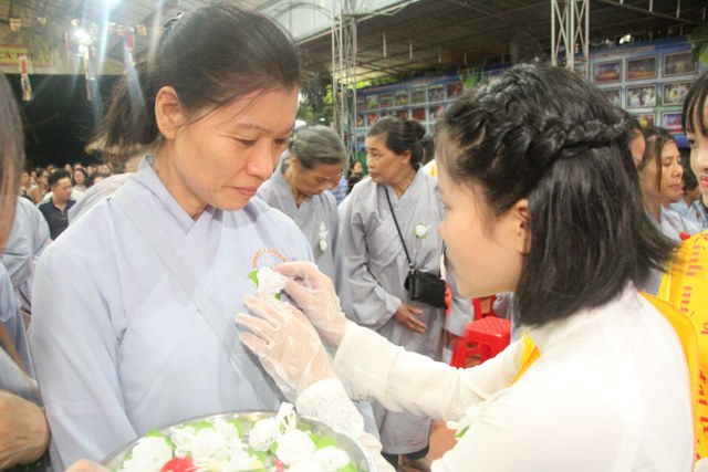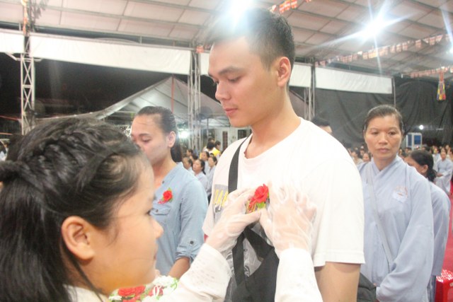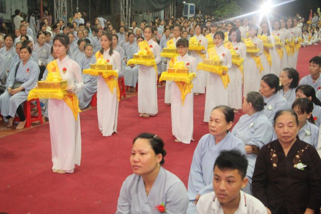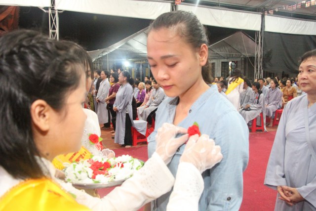 Chương trình buổi lễ gồm các phần: niêm hương bạch Phật, dâng lục cúng dường, nghi thức cài hoa hồng, cảm niệm mùa Vu Lan, tác bạch dâng y chư tôn đức chứng minh. Các nghi thức diễn ra trong không khí trang nghiêm, thành kính. Đặc biệt là phần nghi thức cài hoa hồng, những giọt nước mắt xúc động của các bạn trẻ khi nghe bạn Nguyễn Lan diễn đọc ý nghĩa của bông hồng cài áo và hồi tưởng về người cha quá cố. Phải chăng lúc này, khi đứng trong không khí ấm áp của buổi lễ và suy tưởng về Cha, về Mẹ, các bạn mới phần nào hối hận những lỗi lầm mình trót gây ra, làm cho Cha Mẹ phải buồn lòng. Hay đó là giọt nước mắt bất hạnh của những người con không còn được sống trong tình yêu thương của Cha của Mẹ! Những nỗi bất hạnh ấy, làm cho mỗi người có mặt trong buổi lễ hôm nay không khỏi hối hận, ngậm ngùi.