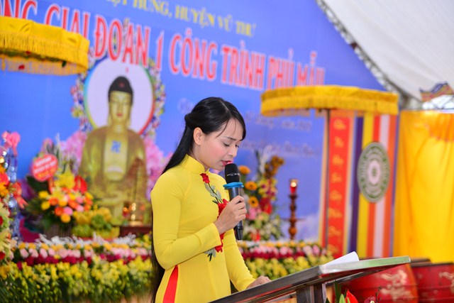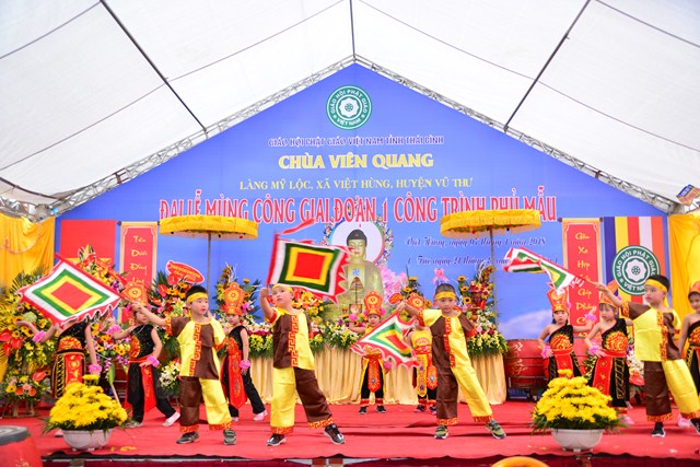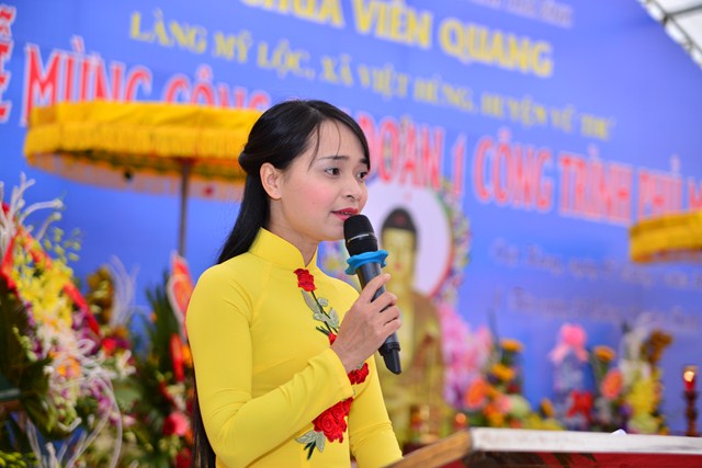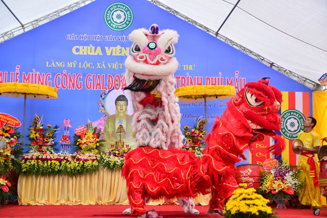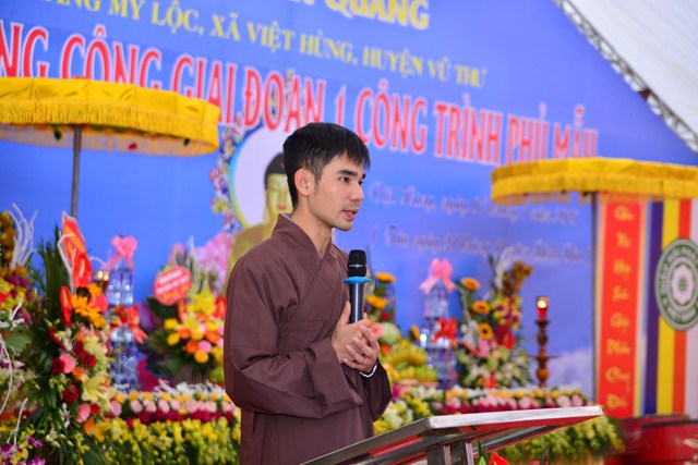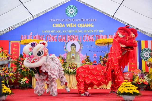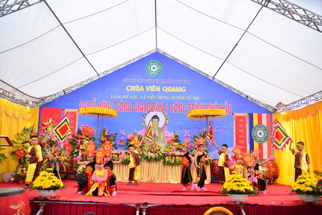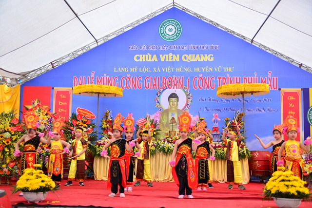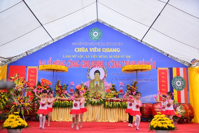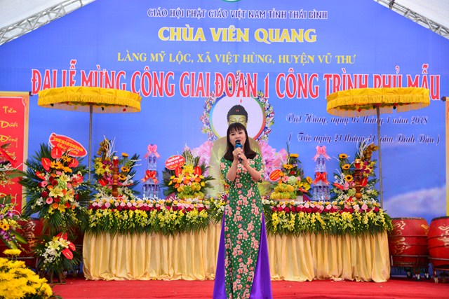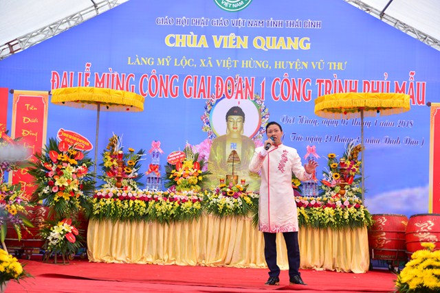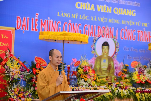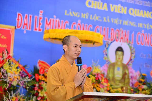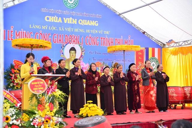 Sau nghi thức niệm Phật cầu gia bị, chào Quốc kỳ và Đạo kỳ, thay mặt cho BTC buổi lễ, đại đức Thích Thanh Quang – Trưởng BTC đã lên phát biểu khai mạc Lễ mừng công giai đoạn 1 công trình Phủ Mẫu chùa Viên Quang. Theo đó, ở hầu khắp các chùa thuộc vùng Duyên Hải Bắc Bộ, ngoài việc thờ Phật ra thì các chùa còn có tục thờ Mẫu Tam Phủ để đáp ứng nhu cầu tín ngưỡng văn hóa, tâm linh của đồng bào và nhân dân địa phương. Việc thờ Mẫu cũng là một truyền thống quý báu của Dân tộc Việt Nam từ ngàn đời nay, đó là truyền thống “ Uống nước nhớ nguồn”, nhằm tri ân những vị anh hùng có công với Đất nước, với Dân tộc. Đặc biệt, di sản “ Thực hành tín ngưỡng thờ Mẫu Tam Phủ của người Việt” đã được UNESCO ghi danh tại Danh sách Di sản văn hóa phi vật thể đại diện của Nhân loại, một mặt góp phần tăng cường vị trí, vai trò của di sản văn hóa đối với xã hội, làm giàu thêm bức tranh đa dạng văn hóa của Việt Nam cũng như của nhân loại. Mặt khác, sẽ làm cho cộng đồng, những người đang thực hành di sản nhận thức sâu sắc thêm về di sản của mình, đồng thời để họ thấy tự hào và tích cực hơn trong công tác tham gia bảo vệ, phát huy giá trị của di sản.