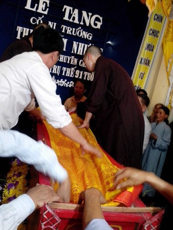 Sau khi hứa khả lời cầu thỉnh của pháp quyến, chư tôn đức đã thành kính niêm hương bạch Phật, cử hành lễ nhập liệm. Trong tiếng niệm Phật trầm hùng, chư tôn đức cùng Phật tử đã thương tiếc cung thỉnh nhục thân Ni trưởng nhập kim quan. Kim quan được tôn trí tại Tổ đường chùa Châu Luân. Cũng tại buổi lễ, TT.Thích Thanh Định thay mặt cho chư Tăng chứng minh cử hành lễ thành phục, phát tang và dâng hương tưởng niệm vị Ni trưởng đạo hạnh của Phật giáo Thái Bình nói chung, Phật giáo Quỳnh Phụ nói riêng. Được biết, chương trình lễ tang Ni Trưởng diễn ra từ 13h00 ngày 04/04 đến 14h00 ngày 05/04. Sau đó, BTS PG tỉnh, BTS PG huyện Quỳnh Phụ cùng môn đồ pháp quyến sẽ làm lễ tưởng niệm, cung thỉnh kim quan nhập bảo tháp trong khuôn viên chùa Châu Luân.