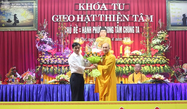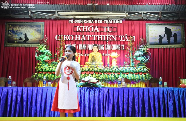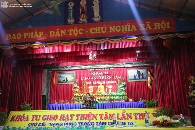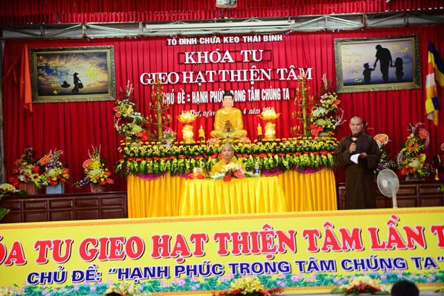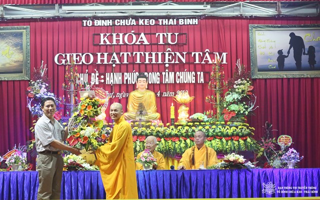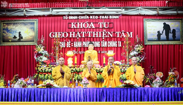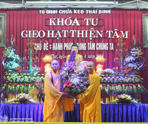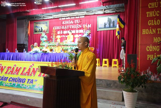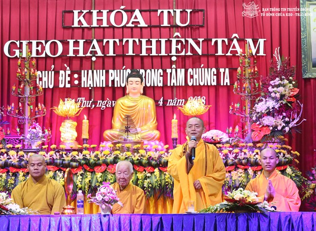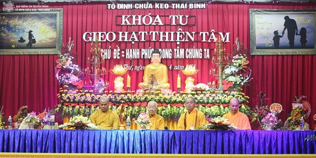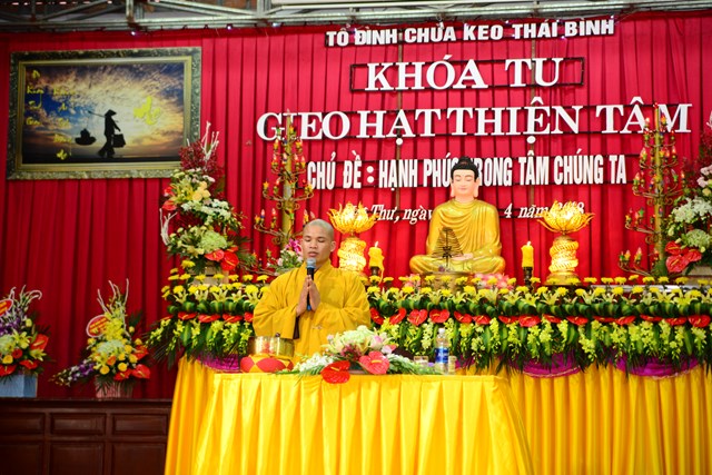 Thay mặt cho BTC khóa tu, Đại đức Thích Thanh Quang – Trưởng BTC khóa tu, trụ trì tổ đình chùa Keo đã lên tuyên đọc Diễn văn khai mạc khóa tu “ Gieo hạt thiện tâm” lần thứ V với chủ đề: “ Hạnh phúc trong tâm chúng ta”. Theo đó, mục đích tổ chức khóa tu vào 3 ngày lễ của năm 2018 là nhằm giúp các em có những ngày nghỉ lễ thật bổ ích và ý nghĩa. Đây cũng là cơ hội để các bạn trẻ tiếp xúc với môi trường sinh hoạt mới, đó là môi trường Phật Pháp, sống trong lục hòa, biết yêu thương, nhường nhịn lẫn nhau. Ngoài ra, các bạn tu sinh còn được tham gia các trò chơi mang tính chất giáo dục cao, trau dồi kỹ năng sống. Bên cạnh đó, các bạn còn được nghe quý thầy giảng pháp, chơi các trò chơi đố vui Phật Pháp, thắp nến tri ân cha mẹ…