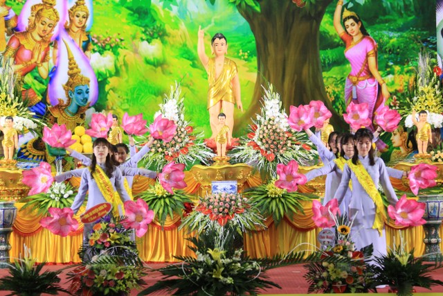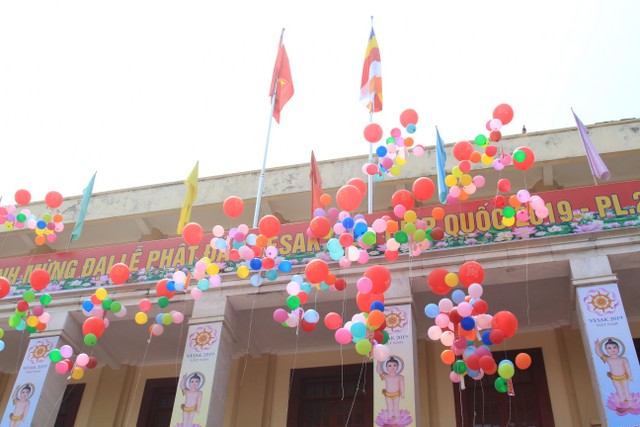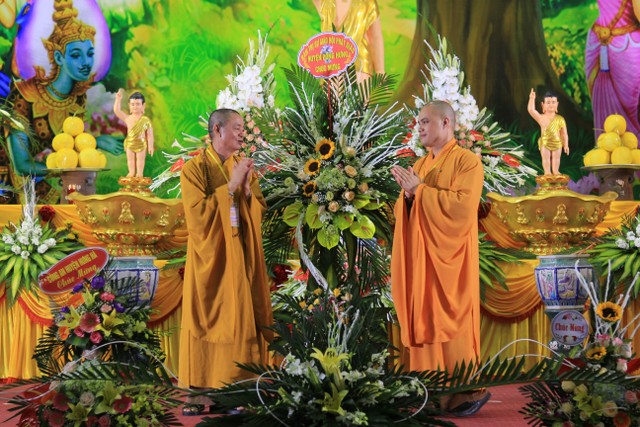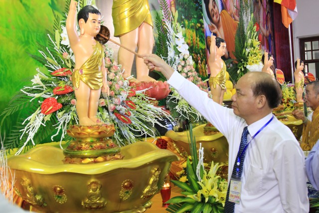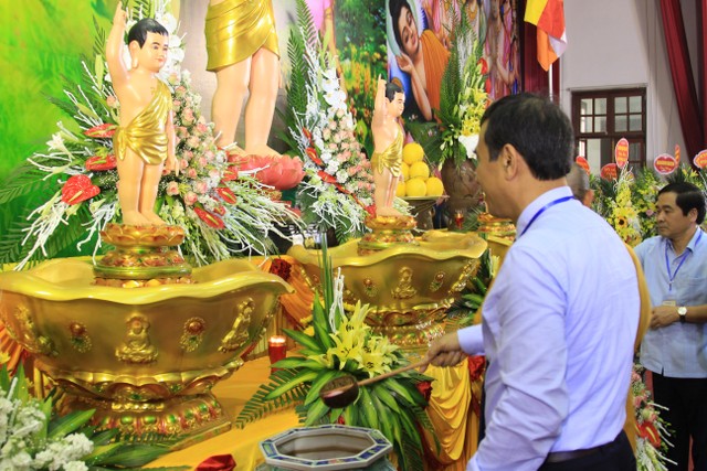 Sau khi tặng hoa chúc mừng, chư tôn đức Tăng Ni, quý đại biểu chính quyền các cấp, Phật tử đã tham gia các nghi thức tại buổi lễ như: niêm hương, nhất tâm tụng bài sám Khánh đản thành kính dâng cúng dàng, tắm Phật, thả bóng bay hòa bình… để cầu cho quốc thái dân an, thế giới hòa bình, đất nước phồn vinh, thịnh vượng.