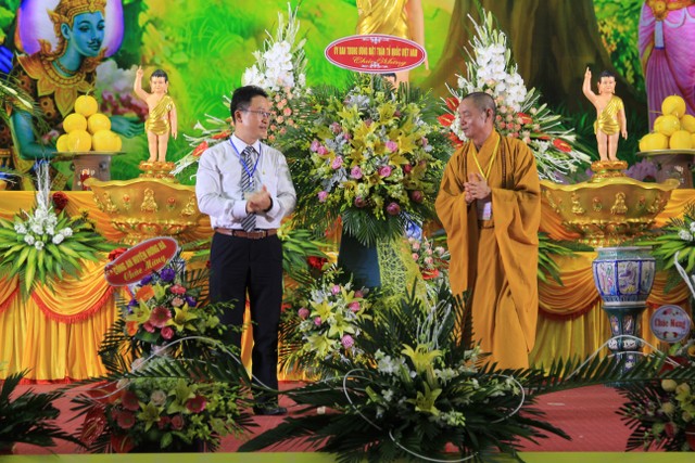 Ban Tổ chức Đại lễ đón nhận lẵng hoa chúc mừng của Đại lão Hòa thượng UVTT HĐCM, lãnh đạo ban Dân vận T.Ư, Ban Tôn giáo Chính phủ, cục An ninh nội địa (bộ Công an); Tỉnh ủy, HĐND, UBND, UBMTTQVN, đại diện Tòa Gi ám mục và các BTS huyện, thành phố mừng Đại lễ Phật đản PL.2563.