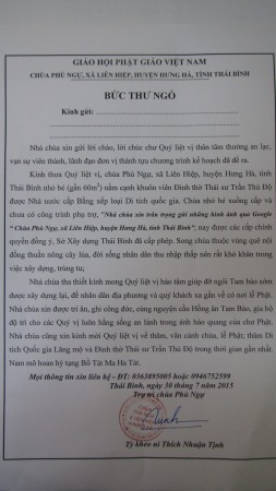 Thái Bình: Tâm thư kêu gọi hỗ trợ chùa Phù Ngự (Liên Hiệp, Hưng Hà)