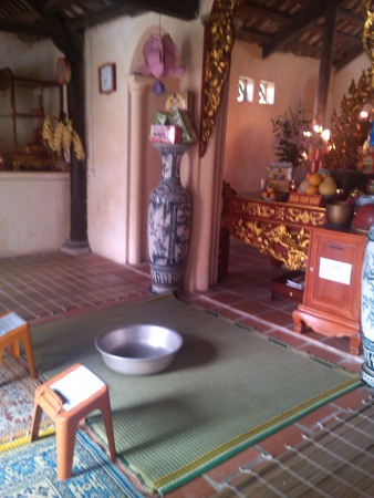 NHÀ Ở CỦA 3 THẦY TRÒ CHÙA PHÙ NGỰ TRONG 10M2. NHÀ Ở CHẬT HẸP, BÊN PHẢI (NHÌN VÀO) LÀ NHÀ KHÁCH ĐÃ XUỐNG CẤP, NÊN THƯỜNG NGÀY PHẢI TIẾP KHÁCH Ở NGOÀI SÂN.
