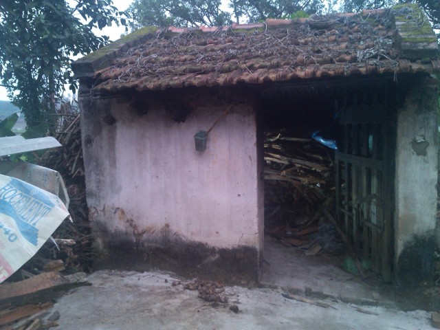 NHÀ KHÁCH XÂY DỰNG CẤP 4, MÁI LÀM BẰNG TRE VÀ LỢP NGÓI MÓC, NHỎ THẤP, KHOẢNG 20m2, TRONG ĐÓ MỘT NỬA DÙNG LÀM KHO CHỨA ĐỒ DÙNG.