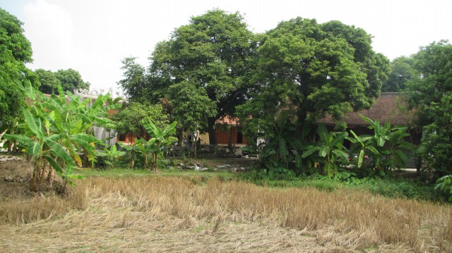 NHÌN PHÍA SAU LẠI CẢNH CHÙA CÒN HOANG SƠ, NHÀ VỆ SINH GIỮA 2 CÂY NHÃN, CẠNH GÓC RUỘNG LÚA, CŨNG CHƯA ĐƯỢC XÂY DỰNG LẠI.
