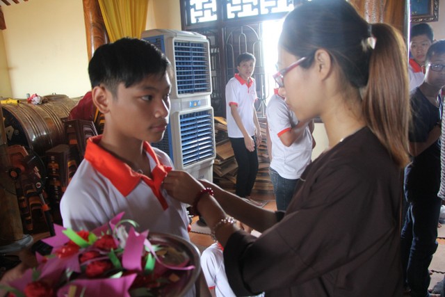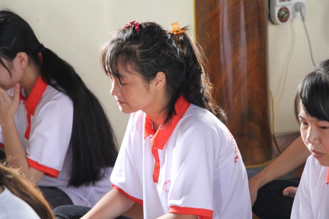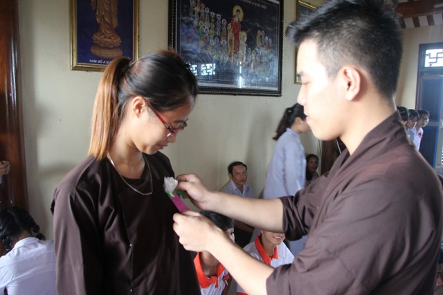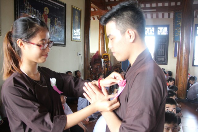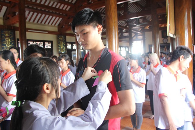 Thời khóa buổi chiều, sau khi thực tập ngồi thiền và lạy Phật – sám pháp địa xúc, các bạn đã được quý Thầy, các bạn thanh niên Phật tử tổ chức lễ “Hoa hồng cài áo”, nhắn nhủ mỗi người biết trân trọng hạnh phúc hiện tại khi còn cha mẹ, phương pháp sống để trở thành người con hiếu thảo. Qua đó, các bạn đã hiểu thêm về ý nghĩa ngày Vu Lan – Hoa hồng cài áo và cách báo hiếu theo quan niệm nhà Phật. Khóa tu kết thúc lúc 17h00 cùng ngày trong sự hoan hỷ của các thầy cô và các bạn học sinh, sinh viên.