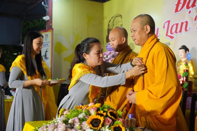 Một trong những nghi thức thiêng liêng không thể thiếu trong mùa Vu lan là cài hoa hồng. Mỗi bông hoa hồng với màu sắc khác nhau, tượng trưng cho những ý nghĩa khác nhau. Những đóa hồng vàng – biểu tượng của lòng biết ơn và sự tri ân sâu nặng đã được cài lên tấm huỳnh y của chư tôn đức – những vị đã dành trọn đời mình để hoằng truyền giáo pháp, dìu dắt hàng hậu học trên con đường tu tập và làm người. Hoa đỏ, hoa hồng, hoa trắng được trân trọng cài lên ngực trái đại chúng như một lời nhắc nhớ rằng, suốt cuộc đời này không có ân nào lớn hơn ân sinh thành dưỡng dục của cha mẹ.