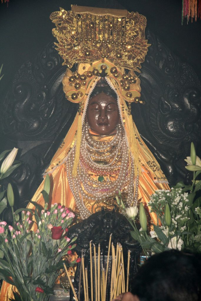 Toàn bộ tượng và bệ thờ cao 2,60m, đặt giữa lòng ngôi tháp chính cao 22,40m, nếu nhìn chính diện, tượng có đến 10 cánh tay, gồm 2 cánh chính với 8 cánh phụ ở đằng sau phù điêu hình lá bồ đề gắn liền với tượng. Đây là sự biểu hiện tính toàn năng. Hai cánh tay chính đặt trên đầu gối, bàn tay trái mở ra với ý nghĩa ban phát, bàn tay phải dựng đứng, lòng bàn tay ngửa ra trước, trong tư thế trấn an. Ý nghĩa chung là đem lại sự bình an và ban hạnh phúc cho mọi người ở mọi nơi. Tám cánh tay phụ gồm có mỗi tay cầm một vật phụ khác nhau như: đoản kiếm, mũi tên, vòng mặt trời Sakra, mũi lao, chuông nhỏ, lưỡi giáo Ankura, tù và bằng vỏ ốc, cách cung. Các cánh tay này tỏa ra hình rẻ quạt, rất sinh động. Tất cả những vật này tượng trưng cho quyền uy và trí tuệ của Nữ thần.