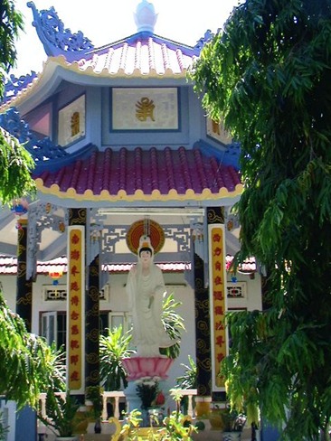 Phía trước sân chùa cây Bồ đề cổ thụ gần 100 tuổi, cành lá xum xuê, như chứng tích quá trình hình thành và phát triển Nghĩa Minh Ni tự, rợp bóng che mát cả sân chùa, là Tượng đài Quán Thế Âm Bồ Tát cao trên 4 mét, với gương mặt hiền hoà, bao dung, phóng tầm mắt xa xăm như đem thệ nguyện của Ngài nhìn thấy mọi thống khổ của chúng sanh, nguyện mang lại bình an, cứu khổ, cứu nạn cho mọi con người miền thuỳ dương cát trắng, đang mê mụi “ Cứ tưởng Ta bà là cõi thật. Thế cho nên tất bật suốt bao ngày” hướng về cõi Phật, bỏ dữ làm lành.