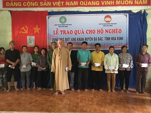 Được sự hỗ trợ của UBMTTQVN địa phương, ĐĐ.Thích Trí Thịnh, Phó BTS PG Hòa Bình đã dẫn đoàn lần lượt đến một số bản thuộc các xã Tiến Thịnh và Vầy Nưa (huyện Đà Bắc), thăm hỏi và trao tặng trên 200 triệu đồng tới 300 hộ gia đình chịu ảnh hưởng của mưa lũ năm 2018, động viên giúp đồng bào vượt qua khó khăn trong đời sống.