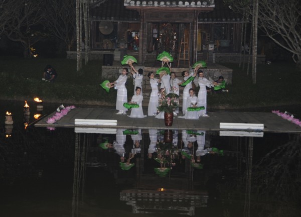 Đêm xuống, quý khách tập trung về phía Vọng Nguyệt trà để trải nghiệm cùng chương trình Đêm Pháp Hoa. Chương trình biểu diễn nghệ thuật ý nghĩa mang tính tâm linh cao cả đã diễn ra trong sự lắng động và tỉnh thức lòng người. Đất trời và cảnh vật nơi đây lung linh, diệu kỳ hòa quyện vào trong tâm của tất cả mọi người có mặt. Những chiếc túi vô ưu của quý khách vẫn tỏa sáng trên nhành cây Vô Ưu khi được quý thầy chuyển hóa những khổ đau…