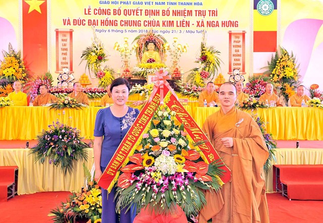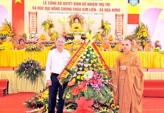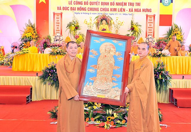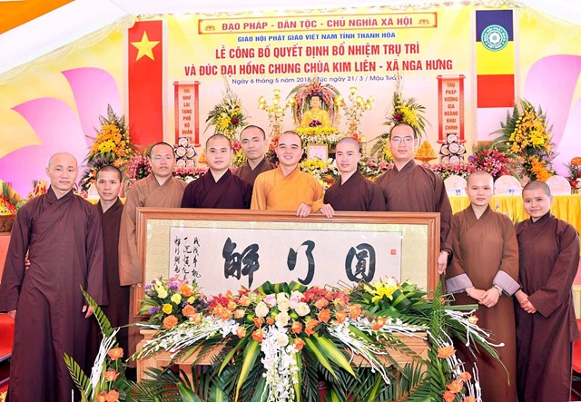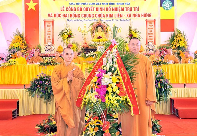 Thay mặt thường trực ban trị sự Giáo hội Phật giáo Việt Nam tỉnh Thanh Hóa Đại đức Thích Nguyên Phong – Phó thư ký – Chánh Văn phòng BTS GHPGVN tỉnh Thanh Hóa đã công bố quyết định bổ nhiệm Đại Đức Thích Nguyên Hiệp trụ trì chùa Kim Liên xã Nga Hưng huyện Nga Sơn tỉnh Thanh Hóa. Đại diện cho cho Chư Tôn Đức Ban chứng minh, Thượng tọa Thích Tâm Đức đã dắt tay Đại đức tân trụ trì ngồi vào ghế “ Trụ pháp vương gia, Trì như lai tạng”.