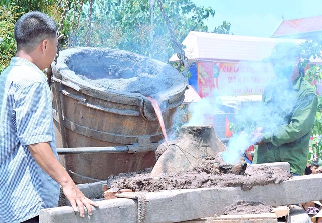 Kết thúc chương trình lễ bổ nhiệm trụ trì, chư tôn đức cùng toàn thể đạo tràng trang nghiêm thực hiện nghi thức trì chú rót đồng đúc đại hồng chung nặng 1 tấn.
