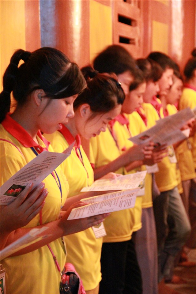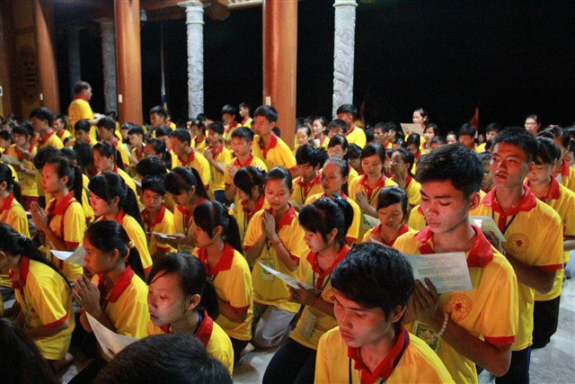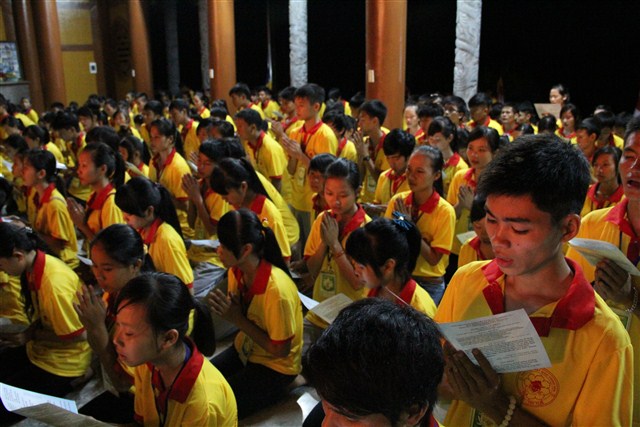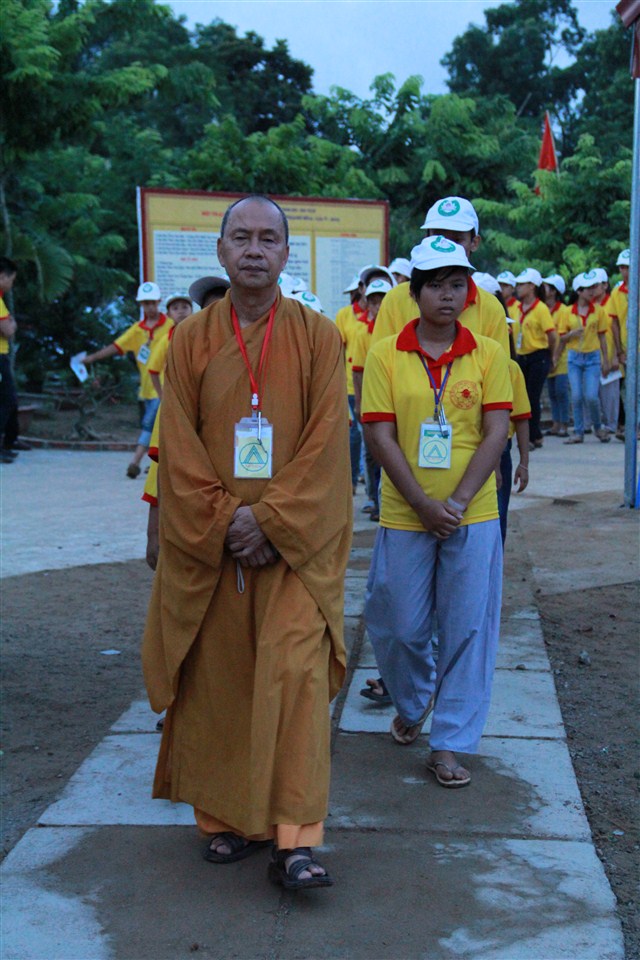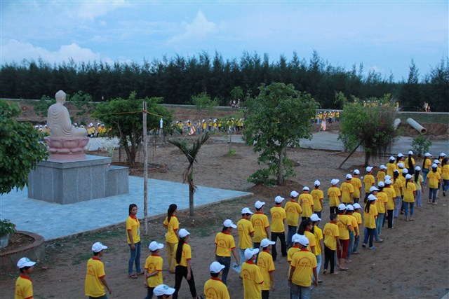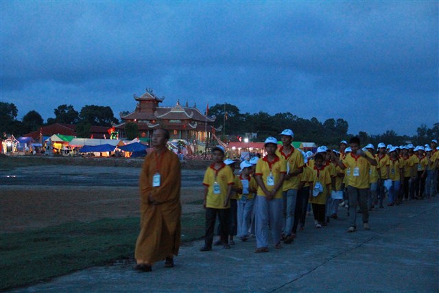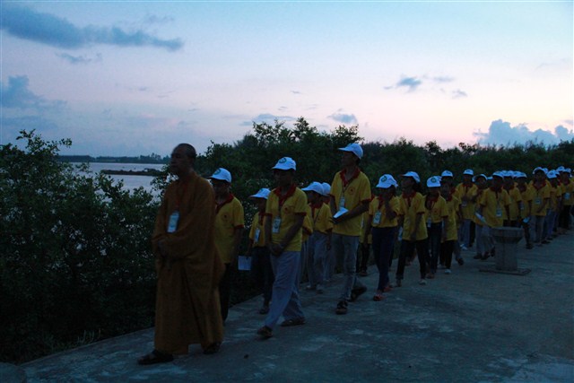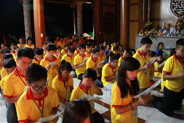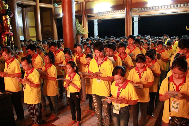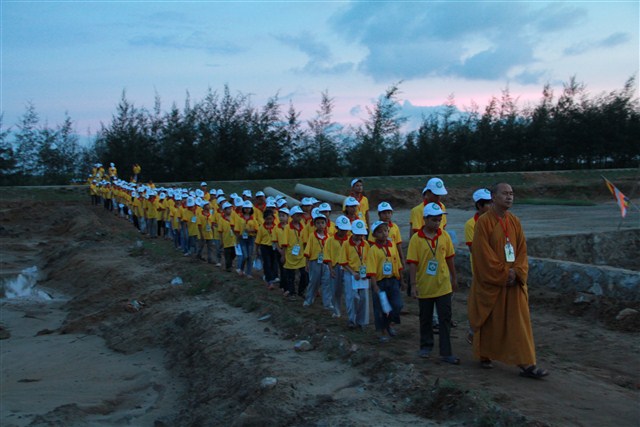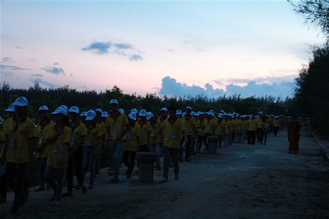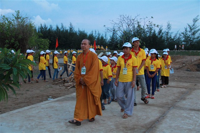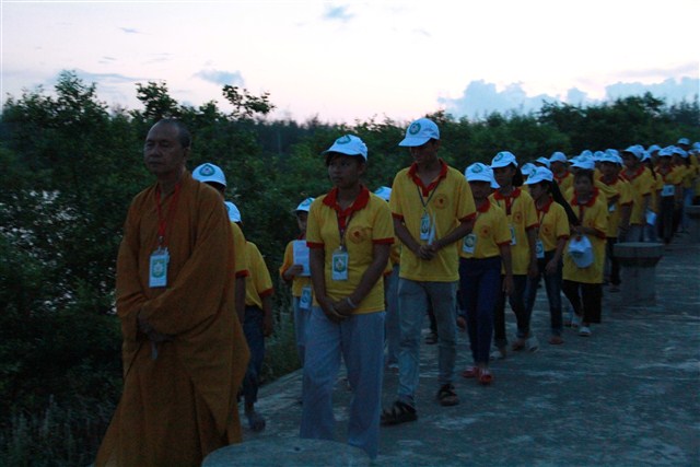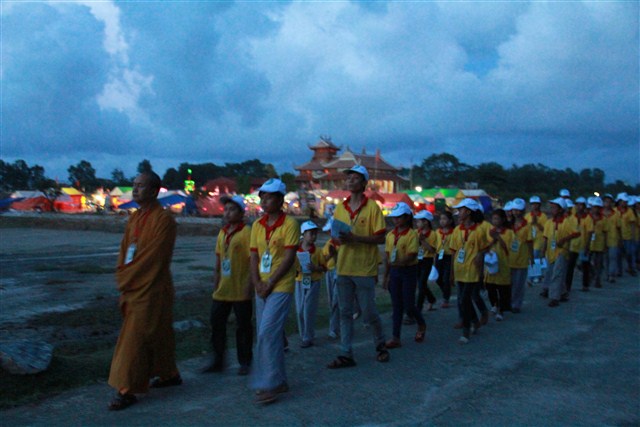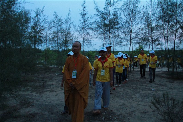 Sau khi tiếng còi báo thức, tất cả các đội đồng loạt thức dậy, vệ sinh cá nhân cùng vân tập về nơi Chánh Điện tụng kinh lễ Phật, sau đó cùng thực hiện thiền hành dưới sự hướng dẫn của ĐĐ. Thích Trúc Thông Tánh – Phó BTC Hội Trại.
