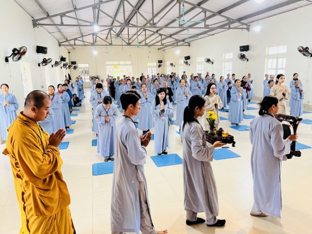 Buổi chiều, Phật tử Diệu Nhất, hướng dẫn đại chúng ngồi tĩnh tâm để thấy mình hạnh phúc trong hiện tại và đọc kinh Thiện Sinh, và niệm Phật kinh hành cũng như dâng lời phát nguyện niệm Phật.Kết thúc ngày tu là giây phút nhận quà pháp bảo. Bên cạnh đó, quý Phật tử về công quả tạo dựng những mô hình tết chào xuân Giáp thìn 2024.
