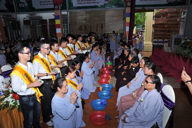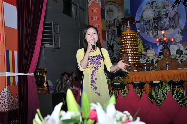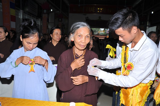 Một nét đẹp trong ngày Vu lan – Báo Hiếu là chương trình bông hoa cài áo. Trong buổi lễ thiêng liêng ấy, ai còn cha mẹ sẽ sung sướng được cài lên ngực áo một đoá hoa hồng màu Đỏ Thắm, ai mất cả cha lẫn mẹ lại buồn tủi cài lên ngực đoá hồng Màu Trắng buồn thương và những ai mồ côi cha hoặc mẹ sẽ cài lên ngực áo mình đóa hoa màu Hồng. Thế nhưng dù còn cha mẹ hay đã mất thì mỗi người con lúc này đang dâng lên một tình cảm biết ơn mẹ cha sâu lắng, và mỗi người tâm niệm sẽ sống hết lòng với bổn phận làm con hiếu của mình. Đại chúng cũng lắng lòng để đón nghe Ý nghĩa cài Hoa Hồng nhân ngày Vu Lan – Báo Hiếu qua phần diễn đọc của Nghệ sỹ Ưu Tú – Phật tử: Thu Hài với giọng đọc trầm ấm, đầy xúc cảm khiến cho các Phật tử có mặt tại buổi lễ đã phải rơi nước mắt khi nghĩ về công ơn của cha mẹ. Hàng ngàn trái tim vần thành tâm hướng về hai đấng sinh thành, ĐĐ. Thích Tánh Khả đã hướng dẫn quý Phật tử thực hiện nghi thức dâng trà, và rửa chân cho Cha Mẹ thật ý nghĩa và cảm động.