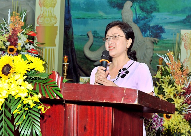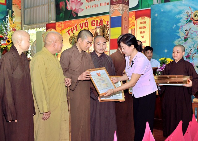 Bà: Lê Thị Huyền – Phó chủ tịch UB MTTQ tỉnh trao giấy khen cho các chùa đạt tiêu chuẩn chùa cảnh tinh tiến năm 2018 -2019