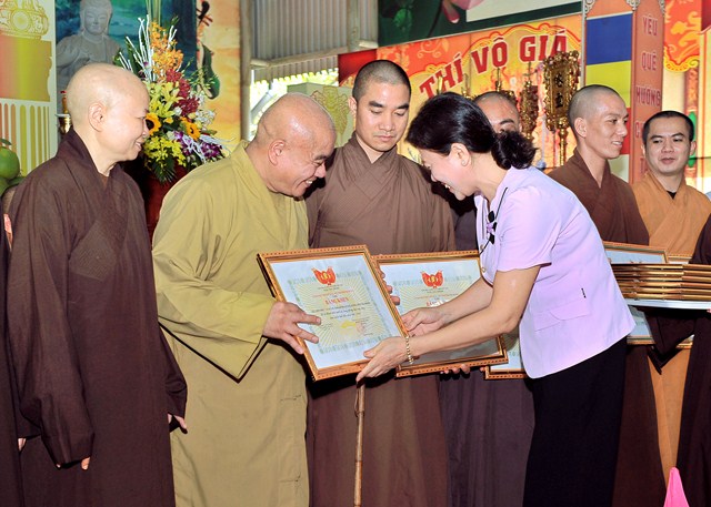 Bà: Lê Thị Huyền – Phó chủ tịch UB MTTQ tỉnh trao giấy khen cho các chùa đạt tiêu chuẩn chùa cảnh tinh tiến năm 2018 -2019