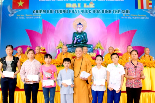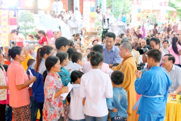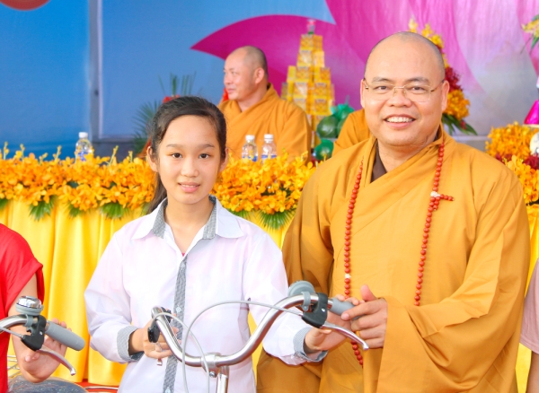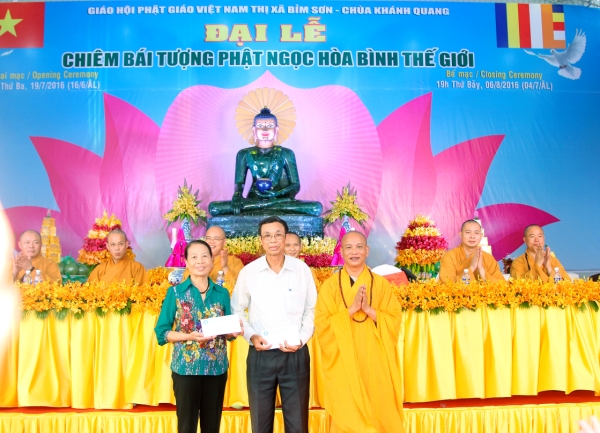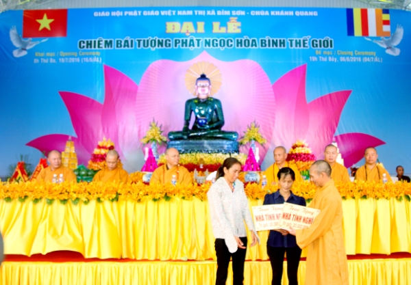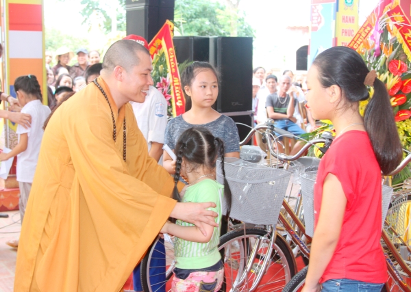 Ngay tại buổi lễ, ĐĐ Thích Tâm Chính – UV dự khuyết HĐTS TƯ GHPGVN, Chánh thư ký BTS GHPGVN Tỉnh Thanh Hóa, Trụ trì Chùa Khánh Quang, đã trao tặng: 200 xuất quà hỗ trợ mua sách vở cho các cháu học sinh có hoàn cảnh khó khăn trên địa bàn Thị xã. 45 chiếc xe đạp. Hỗ trợ 2 căn nhà đại đoàn kết, mỗi căn trị giá 20 triệu đồng, ủng hộ 30 triệu đồng cho quỹ khuyến học thị xã Bỉm Sơn và Xã Quang Trung. Tổng trị giá 200 triệu đồng.
