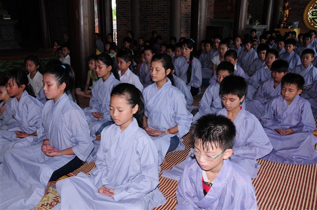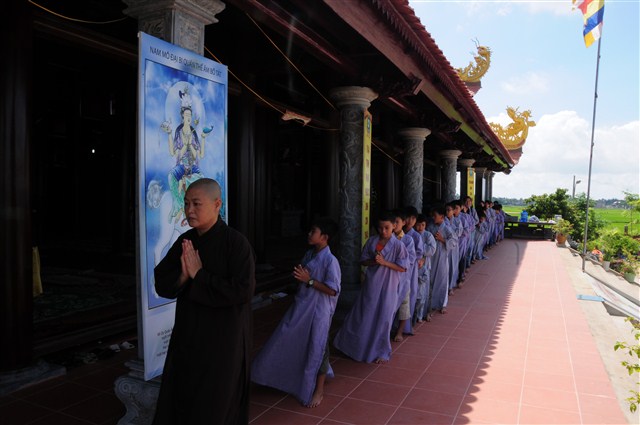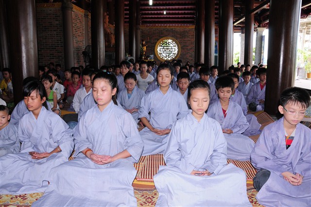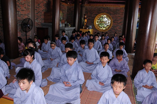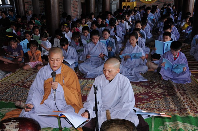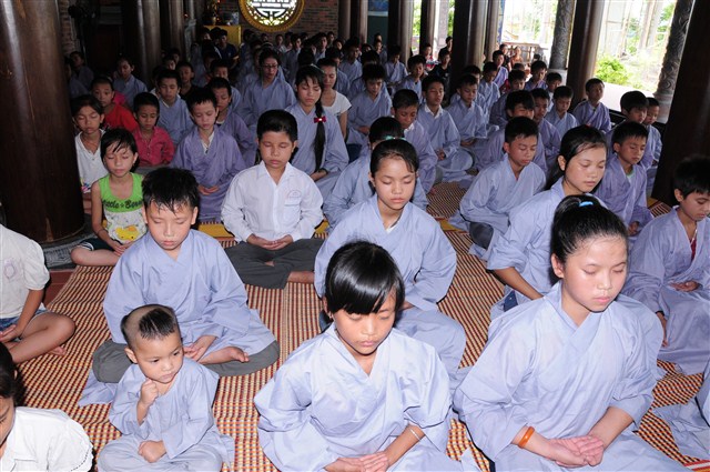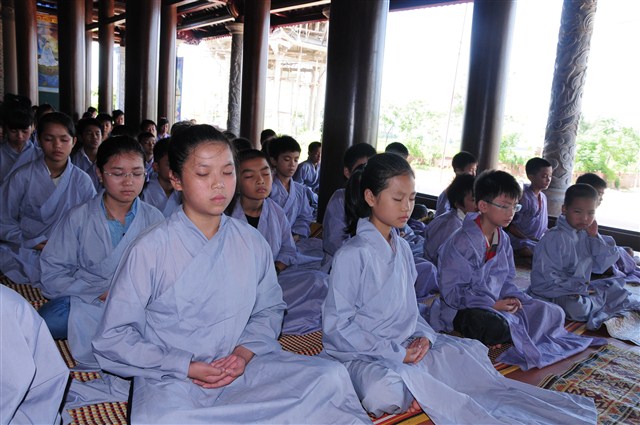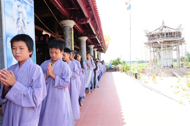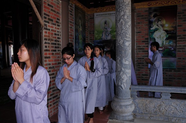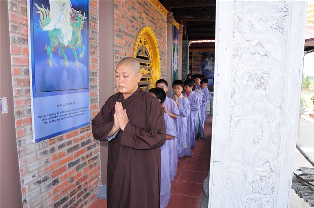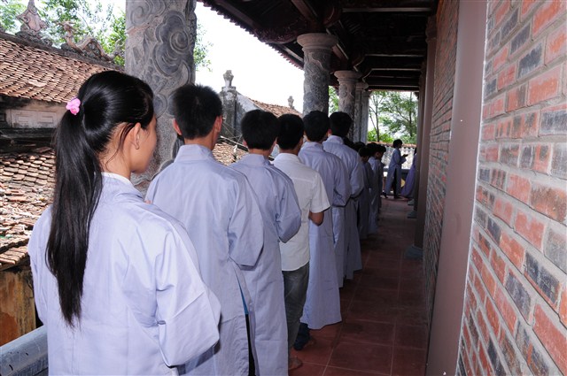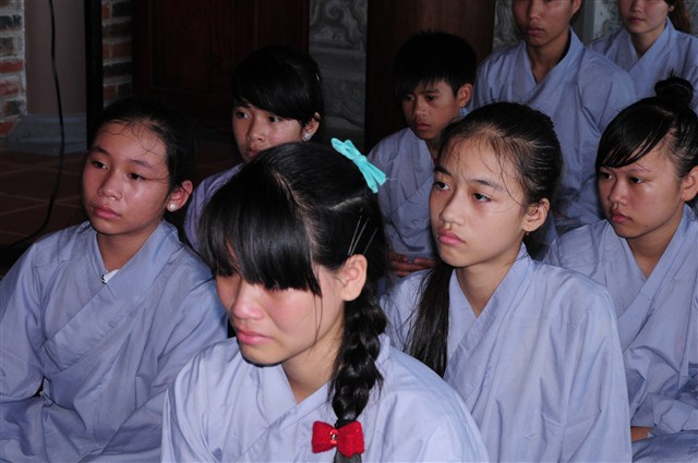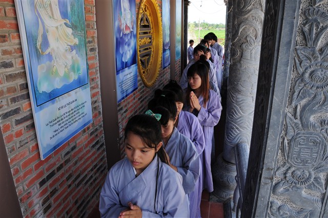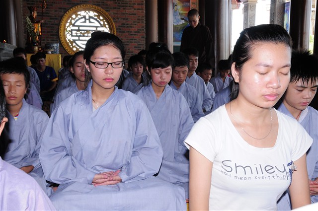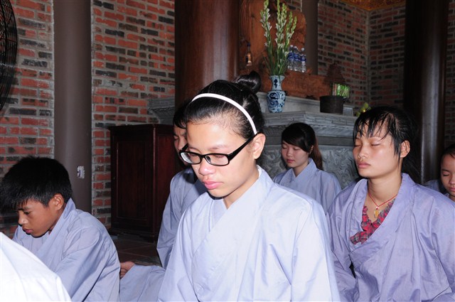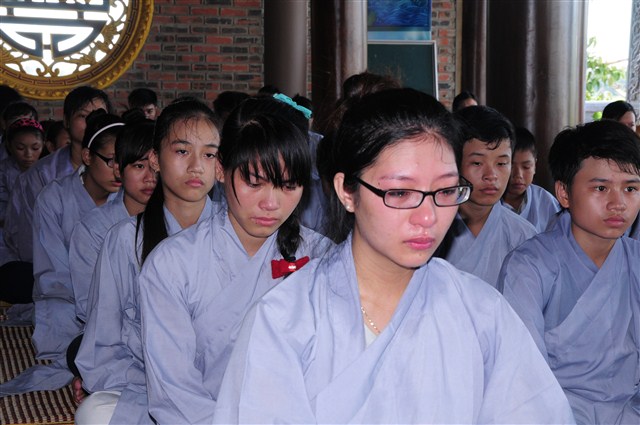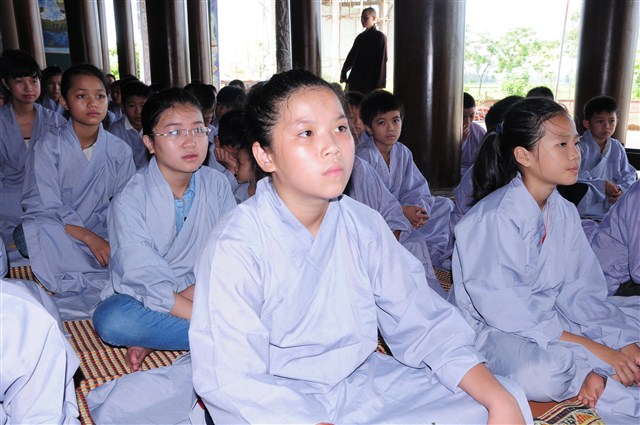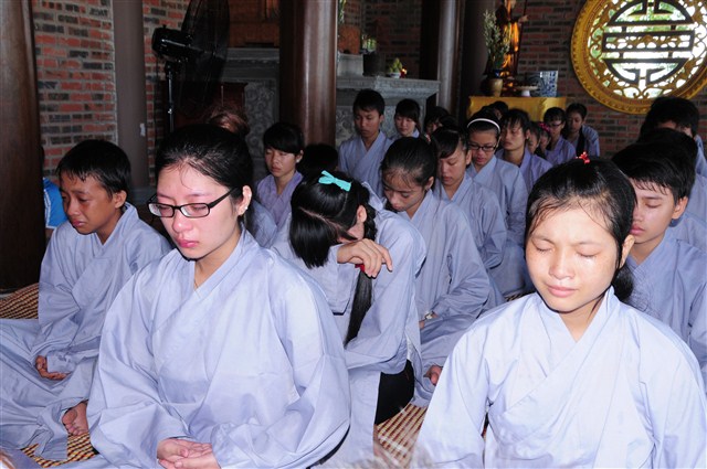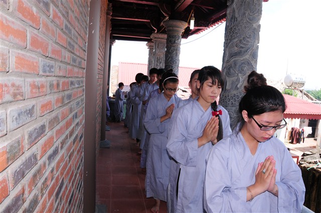Vẫn tiếng niệm Phật của hơn 100 bạn trẻ nơi mái chùa Hồi Long vang lên nhịp nhàng và đều đặn trong không gian nắng nóng của mùa hè,  cùng những lời kinh Sám Hối thật thiết tha, những bước chân nhẹ nhàng đặt trên mặt đất với sự tĩnh giác chánh niệm trong hơi thở ra vào, các em đã có những giây phút tĩnh tâm và lắng nghe sư cô Thích Nữ Huệ Phước trụ trì chùa Yên Lộ – Thiệu Hóa chia sẻ về công ơn trời biển của Cha Mẹ khiến những giọt nước mắt đã lăn tròn trên bờ má của các em với những ăn năn với lầm lỗi của mình và niềm thương kính đối với cha mẹ…