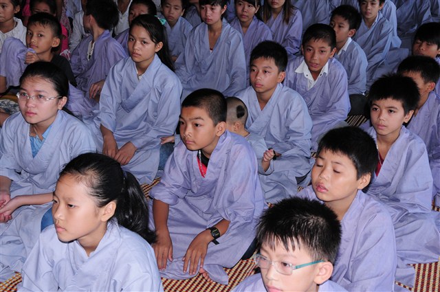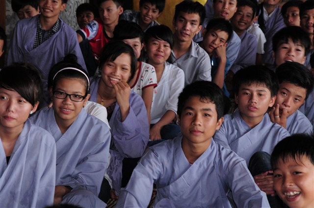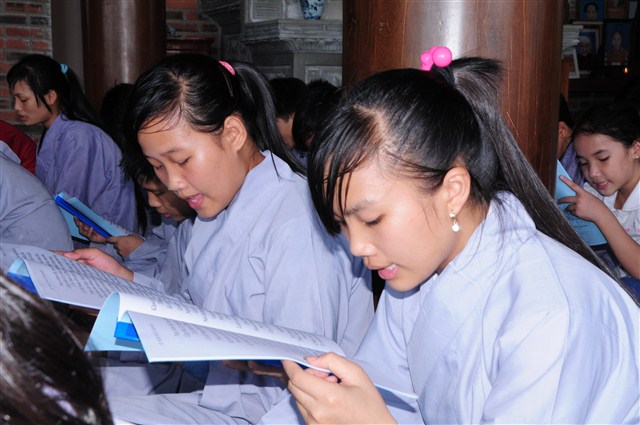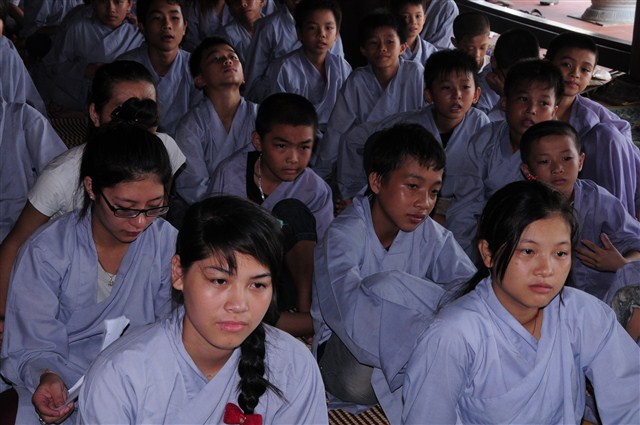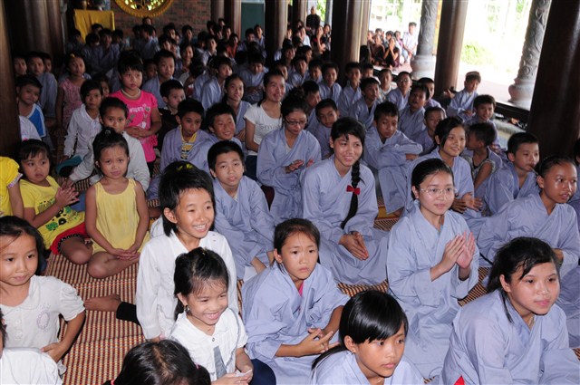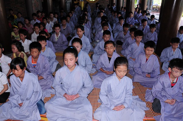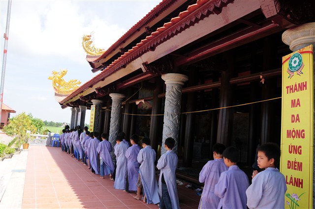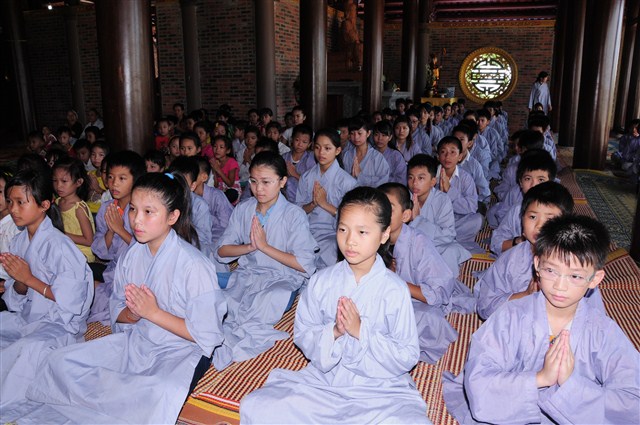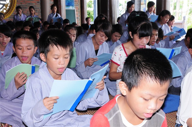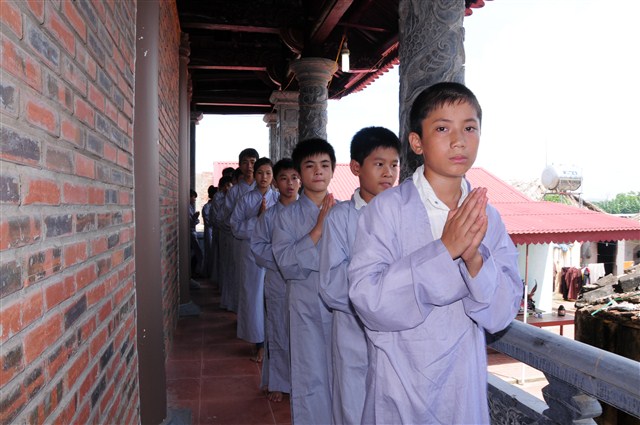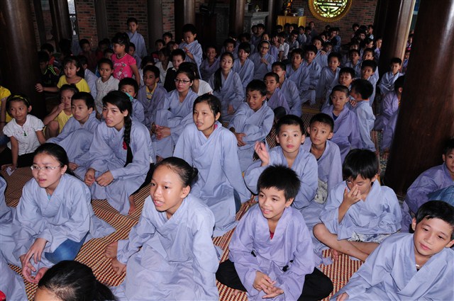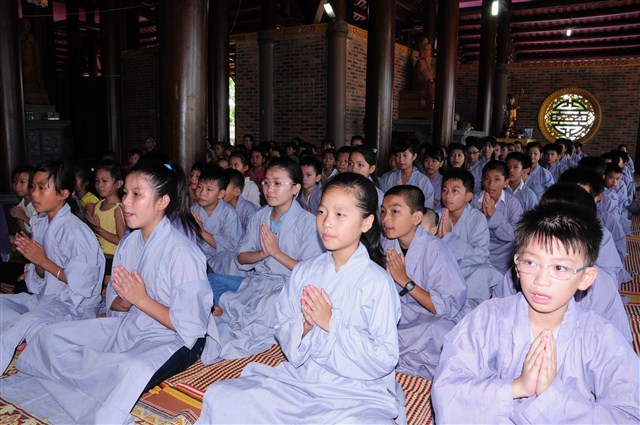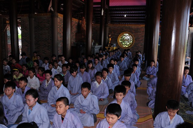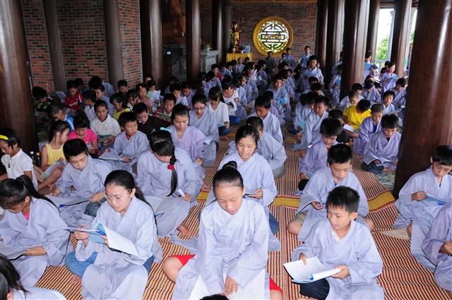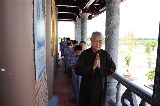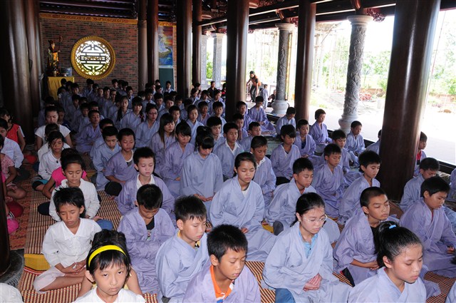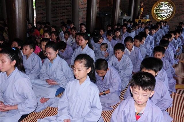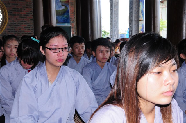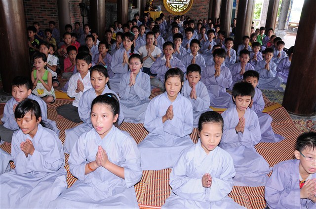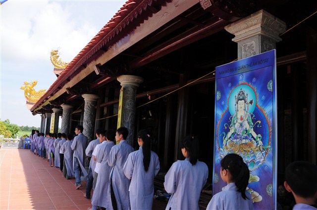 Vẫn tiếng niệm Phật của hơn 100 bạn trẻ nơi mái chùa Hồi Long vang lên nhịp nhàng và đều đặn trong không gian nắng nóng của mùa hè,  cùng những lời kinh Sám Hối thật thiết tha, những bước chân nhẹ nhàng đặt trên mặt đất với sự tĩnh giác chánh niệm trong hơi thở ra vào, các em đã có những giây phút tĩnh tâm và lắng nghe sư cô Thích Nữ Huệ Phước trụ trì chùa Yên Lộ – Thiệu Hóa chia sẻ về công ơn trời biển của Cha Mẹ khiến những giọt nước mắt đã lăn tròn trên bờ má của các em với những ăn năn với lầm lỗi của mình và niềm thương kính đối với cha mẹ…