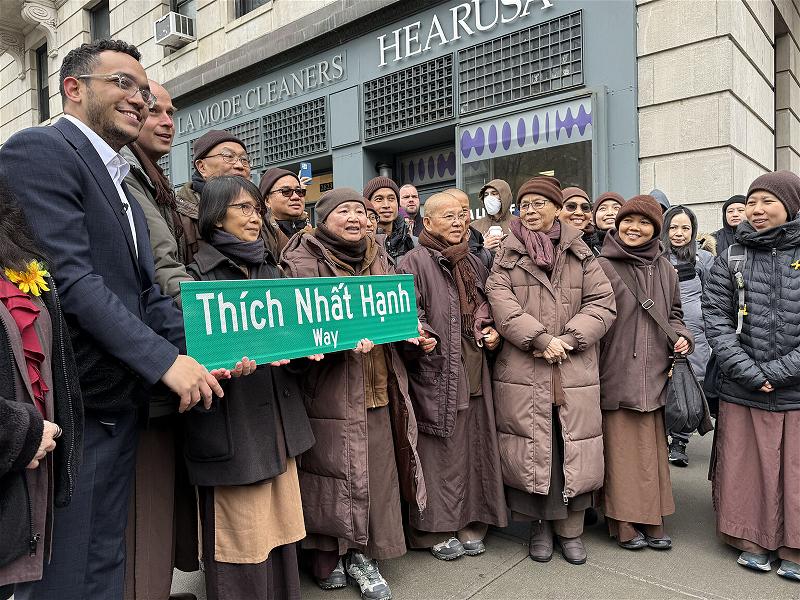 Đám đông, nhiều người trong số họ là một phần của truyền thống Phật giáo Làng Mai của Thích Nhất Hạnh, đã tạo ra một sự im lặng thanh thản tại sự kiện — trái ngược với tiếng còi báo động xe hơi và còi cảnh sát thông thường vào buổi sáng — bằng cách sử dụng phiên bản tiếng vỗ tay của Ngôn ngữ ký hiệu Hoa Kỳ, mà họ gọi là “hiển lộ những bông hoa của họ”. Các tu sĩ từ một số tu viện của Thầy Nhất Hạnh, bao gồm Deer Park ở California và các tu viện Blue Cliff ở phía bắc New York, đã tới tham dự để kỷ niệm việc đặt tên đường, hát những bài thơ của Thiền sư sau khi hít thở sâu nhiều lần như một.