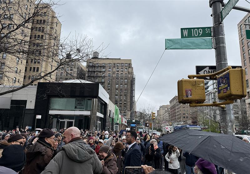 Hàng chục nhà sư Phật giáo và cư sĩ tụ tập tại một góc phố đông đúc ở Upper West Side, New York City, vào một ngày mưa lạnh để chứng kiến lễ dựng bảng tên đường mới mang tính lịch sử để vinh danh nhà lãnh đạo tinh thần của họ vào Thứ Sáu, ngày 11 tháng 4/2025.