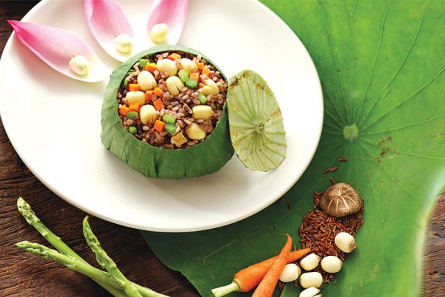Cơm hấp lá sen là món ăn chay mang hương vị nhẹ nhàng, thanh tao với vị dẻo thơm trong từng hạt gạo cùng vị bùi bùi của hạt sen được bọc trong lớp lá sen mỏng. Cơm sen là một món đặc sản của nhiều nhà hàng sang trọng, như một nét chấm phá thanh tao trong bàn tiệc. Đĩa cơm sen với lá sen bọc bên ngoài luôn được đặt trang trọng ở trung tâm bàn ăn. Để thực hiện món cơm đặc biệt này, gạo tám thơm phải được vo kỹ, để thật ráo nước rồi nấu chín. Cơm nấu xong dàn ra mâm để hạt cơm tơi đều. Hạt sen ngâm nước khoảng 2 giờ rồi luộc trong nước có một tí muối đến khi hạt sen có vị thơm bùi. Đậu Hà Lan trụng qua nước sôi, cà rốt cắt hạt lựu, nấm đông cô ngâm nở mềm cắt hạt lựu. Bắt chảo lên bếp cho nóng chảo rồi cho dầu ăn, boa rô vào phi thơm, cho tiếp nấm đông cô, cà rốt, hạt sen, đậu Hà Lan vào xào, nêm nếm vừa ăn. Cho hết phần rau củ vừa xào vào trộn đều với cơm trắng rồi cho phần cơm trộn này vào khay có lót lá sen. Cho phần cơm gói lá sen đem hấp khoảng 10 phút là ta đã có món cơm hấp lá sen với hương thơm ấm áp, thanh tao của lá sen.