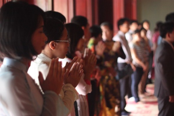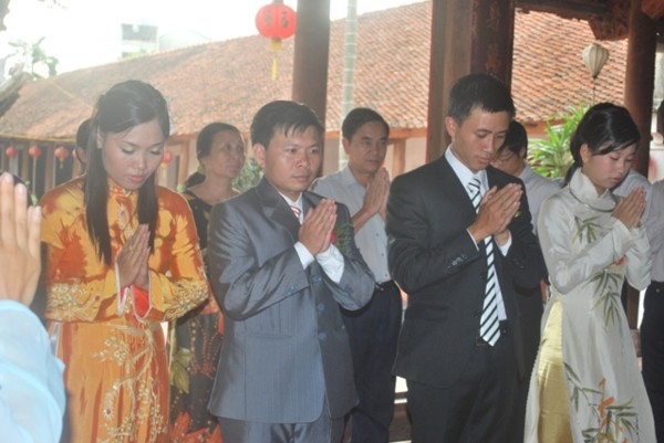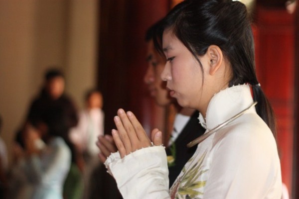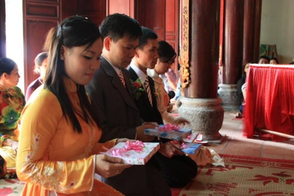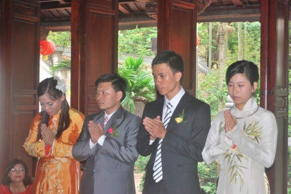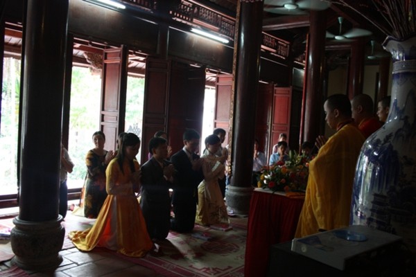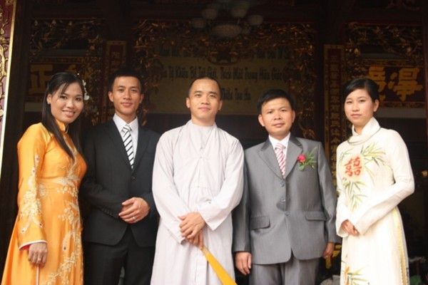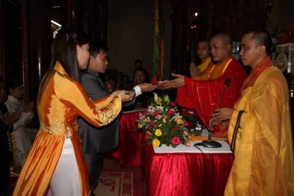 Ttrong không khí trang nghiêm, thành kính, hai đôi bạn trẻ đã chính thức trở thành vợ chồng dưới sự chứng minh của ngôi Tam Bảo.