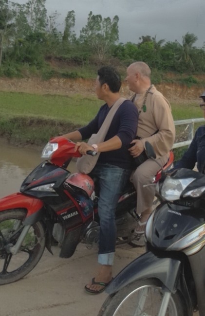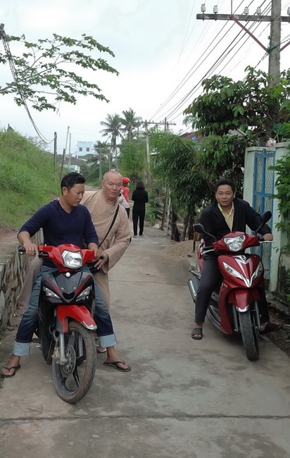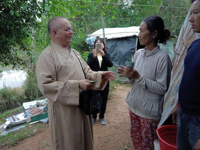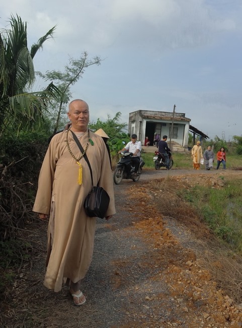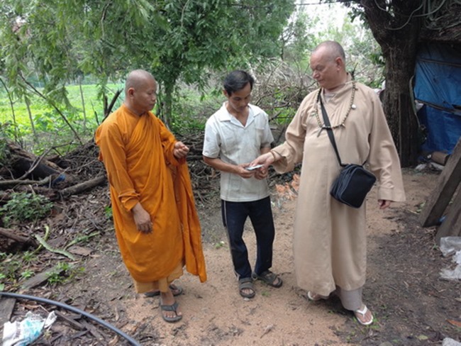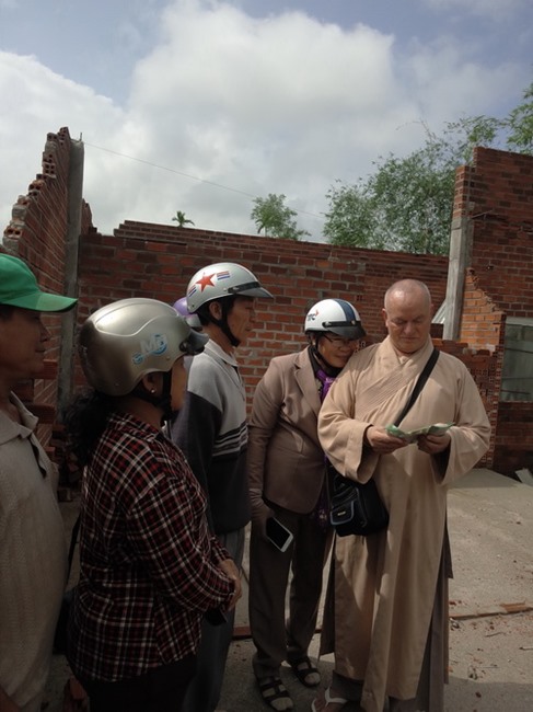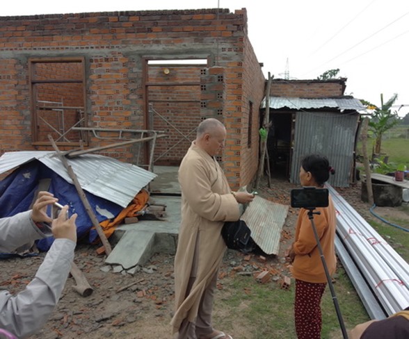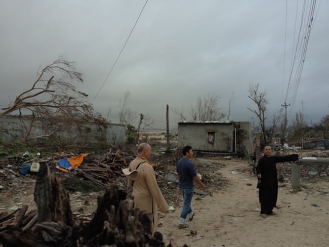 Trong khi cả nước tưng bừng chuẩn bị đón chào năm mới 2018 thì bước chân người tu sĩ lặn lội đi tới cái rốn của tâm bão tại huyện Văn Ninh tỉnh Khánh Hòa. Cho dù thầy đã từng theo dõi những clip video, xem hình ảnh trên phương tiện truyền thông đã thấy kinh hoàng trước thảm cảnh của cơn bão hoành hành, nhưng khi thầy trở về Việt Nam đặt chân tới Khánh Hòa, bước tới tận nơi những căn nhà, những ngôi chùa chỉ còn trơ lại cái nền nhà ngổn ngang vì kèo, mái tôn, lởm khởm gạch ngói mới thấy con tim nhói đau đến nhường nào. Nghẹn ngào khó cất lên lời khi chứng kiến những người trong gia đình già, trẻ, lớn, bé nheo nhóc, ngơ ngác, thất thần.