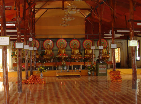 Trong chính điện, một khoảng không gian rộng rãi, thoáng mát với lối xây dựng cột ẩn tường, thờ độc tôn Đức Phật Thích Ca với bộ hoàng y thếp vàng lộng lẫy. ánh sáng tự nhiên, lung linh, huyền ảo được xuyên từ khoảng cách hai từng mái chồng nhau hoà cùng đèn nến khói hương tạo cho nội thất chính điện vừa trang nghiêm lại vừa linh thiêng đã toát lên nét rất riêng trong cách bài trí tượng thờ của thiền viện.