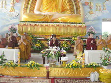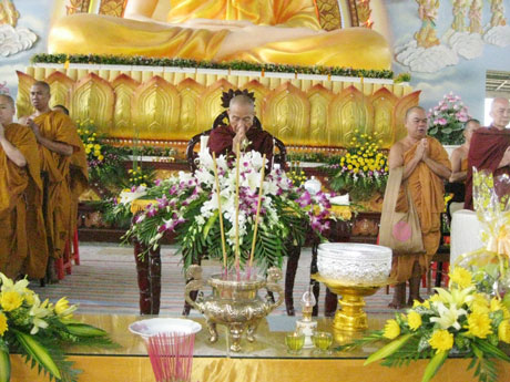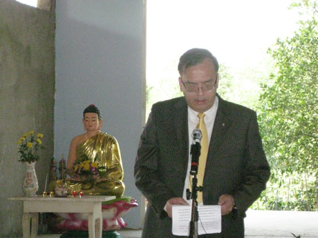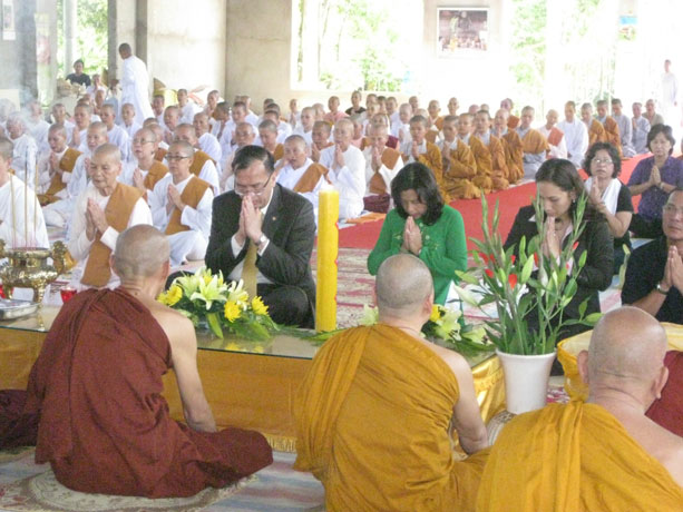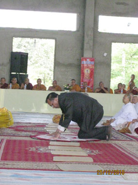 Hình 9: Ông Lê Thành Ân, Tổng lãnh sự Hoa Kỳ tại TP. HCM đảnh lễ HT Kim Triệu trước khi phát biểu chúc mừng khóa thiền