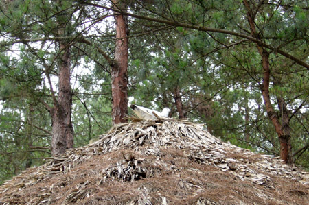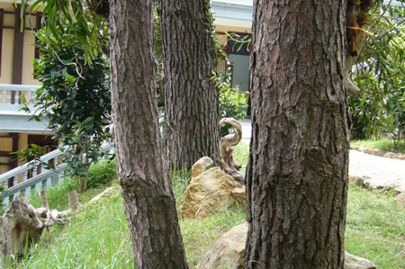 Rải rác quanh đại điện là những chiếc bàn bê tông giả gỗ sạch sẽ, tự nhiên, là nơi thiền viện dựng lên cho du khách dừng chân nghỉ ngơi ngoạn cảnh và đắm chìm vào với thiên nhiên. Thiên nhiên ở đây không hoang dã và khơi gợi hứng thú khám phá, mà chỉ đơn giản là tự nhiên, nhỏ bé và hiền lành. Những dòng nước chảy bên khe của bậc cầu thang làm nên âm thanh đặc trưng của núi rừng. Những lối đi rải sỏi mát rượi bàn chân nâng niu da thịt. Những chú chim câu gù trên mái chòi nghỉ đem lại sự thích thú. Những chú bướm nhỏ dịu dàng bay không một chút e sợ và những chú bọ ngựa ngủ trưa trên tán gỗ thông mang về sự bình yên…