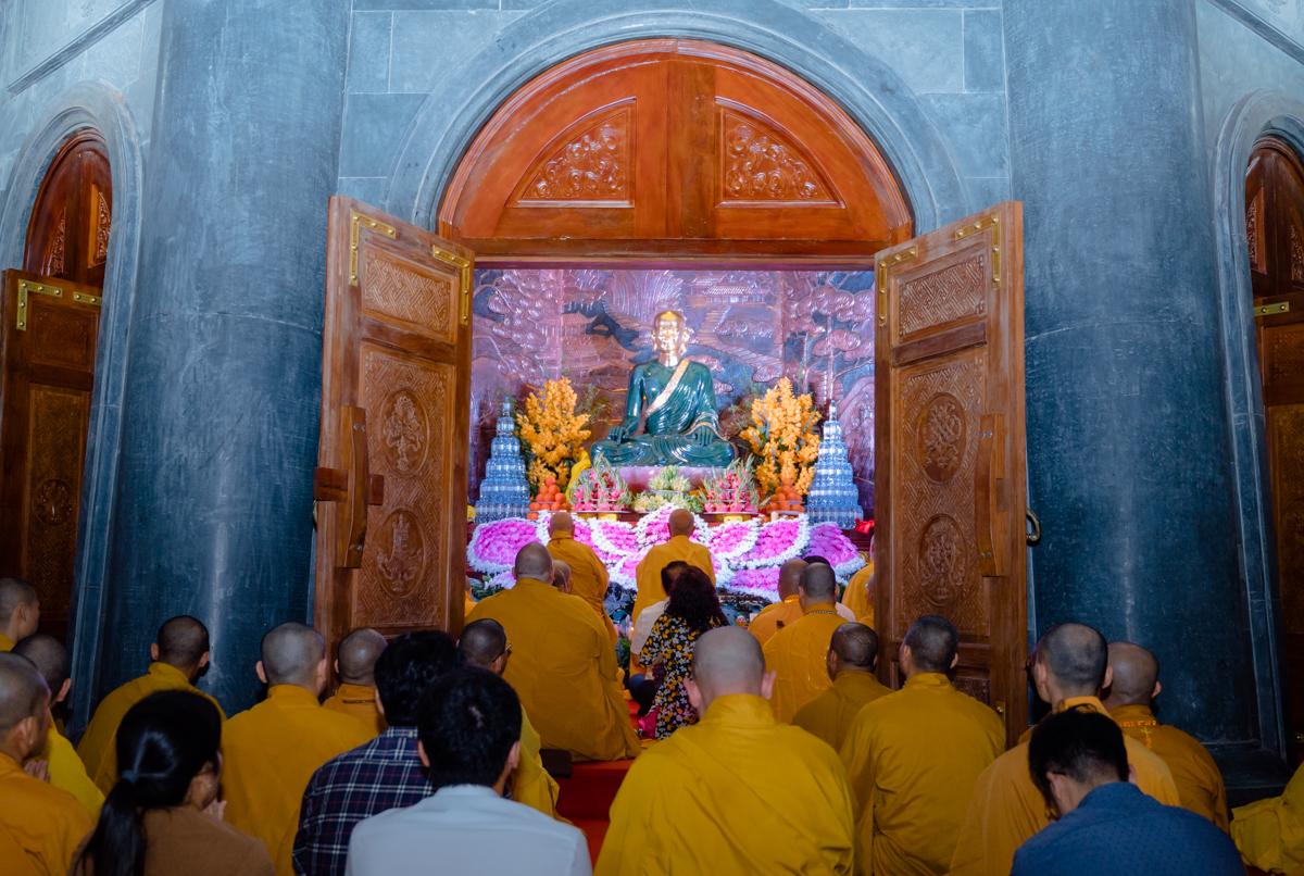 Trong lòng Bảo tháp Phúc Sơn, chư tôn giáo phẩm lãnh đạo Giáo hội nhất tâm niệm Phật, tụng kinh Bát-nhã, trì chú Đại bi, thực hiện nghi thức “Hô thần nhập tượng”.