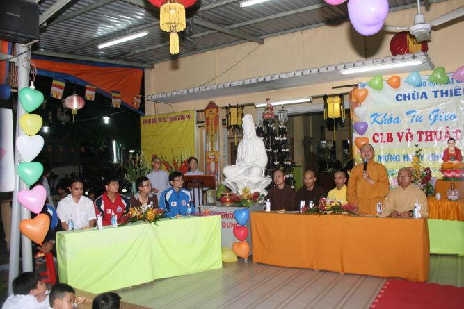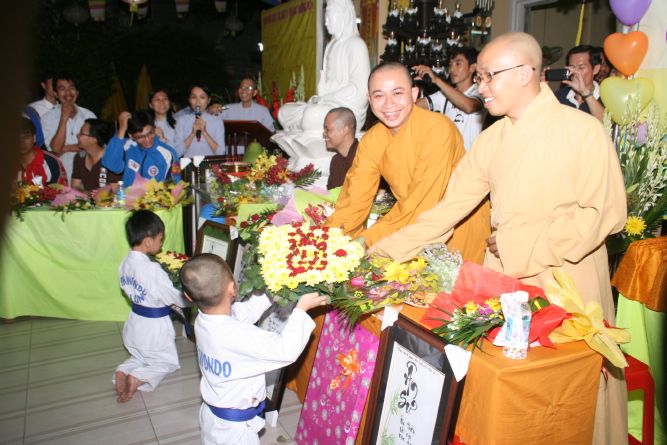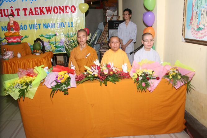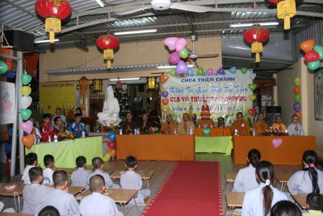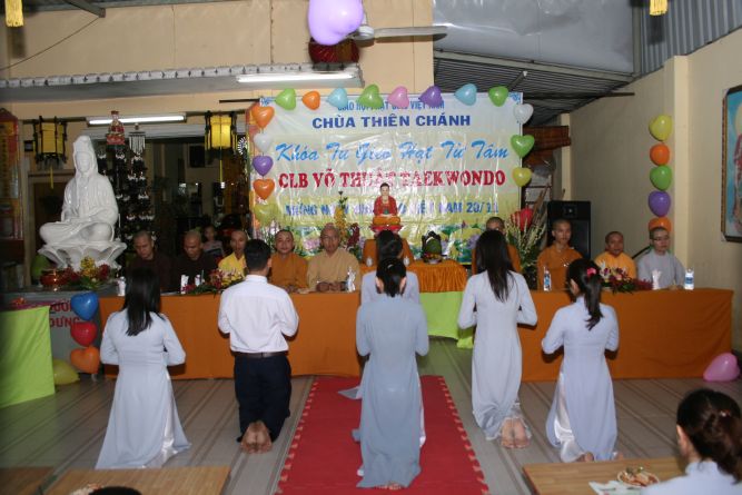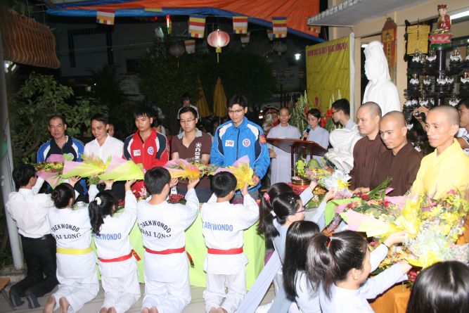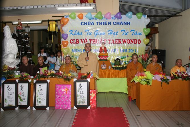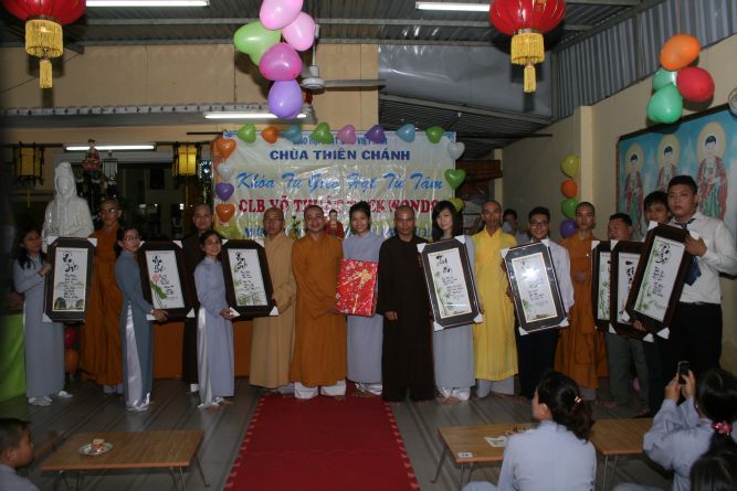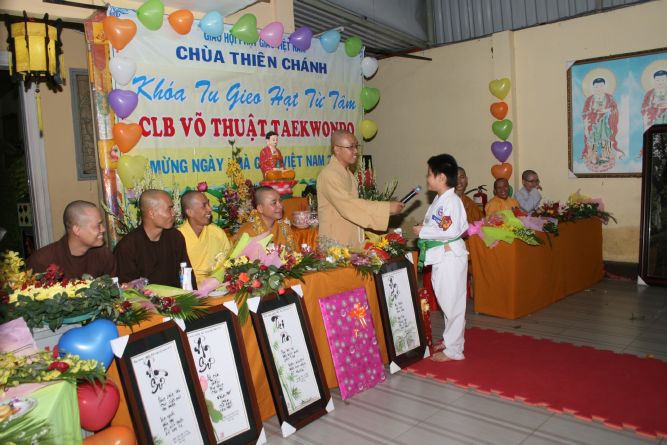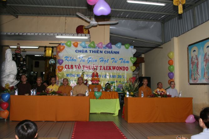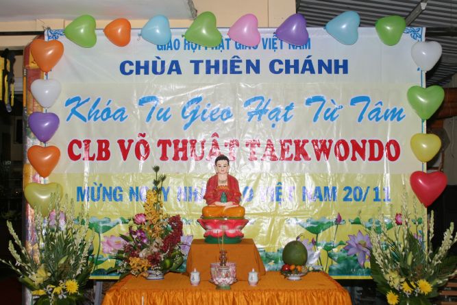 Nếu như ngày 15/11 vừa qua, cũng tại ngôi chùa Thiên Chánh nhỏ bé thân thương này đã diễn ra lễ 20/11 của lớp giáo lý dành cho những bậc ân sư của mình, thì đêm nay, cũng tại ngôi chùa này, một lần nữa đại lễ tri ân quý thầy, quý sư cô nhân ngày nhà giáo được tổ chức trọng thể để hoài niệm về những ông lái đò tận tụy với đàn em, đó là buổi lễ rất ấm cúng do các em thanh thiếu niên khóa tu “Gieo hạt từ tâm” và CLB võ Thuật Teakwondo thực hiện.