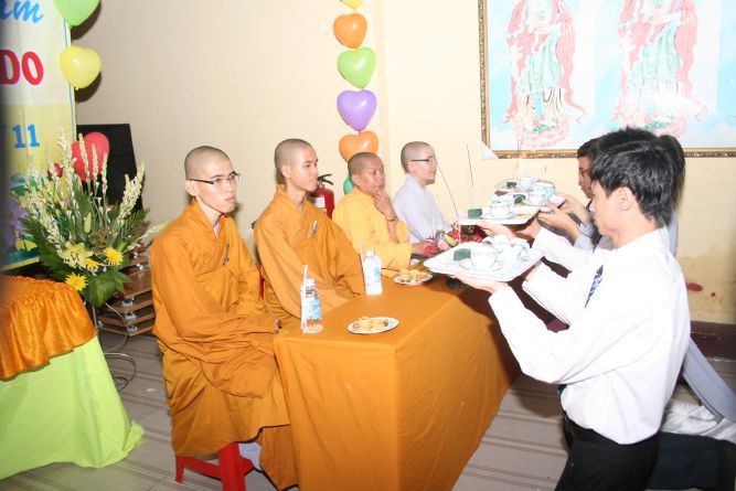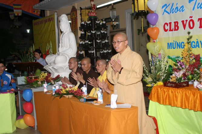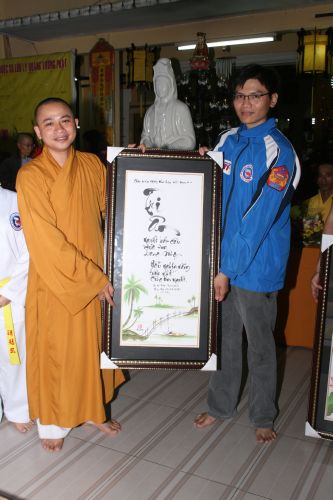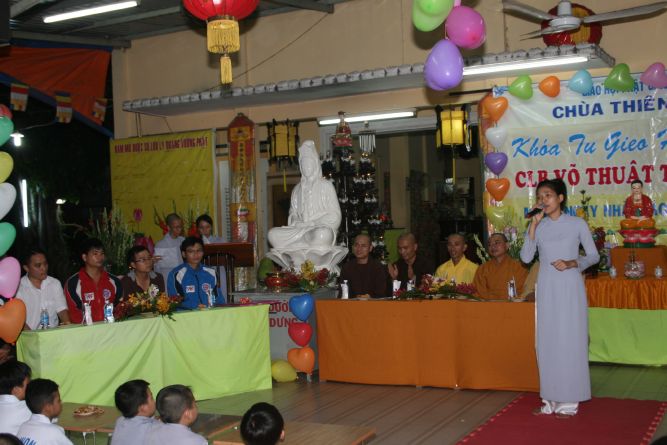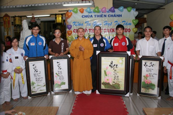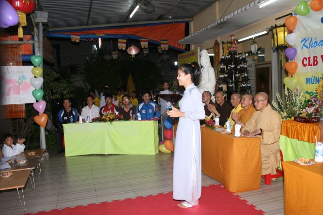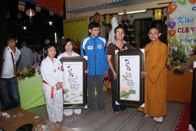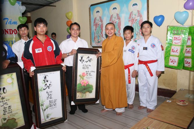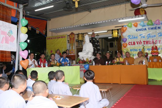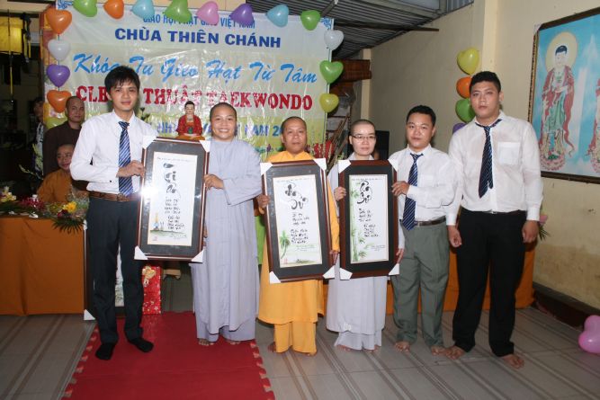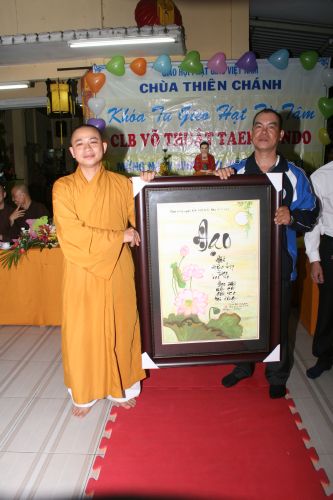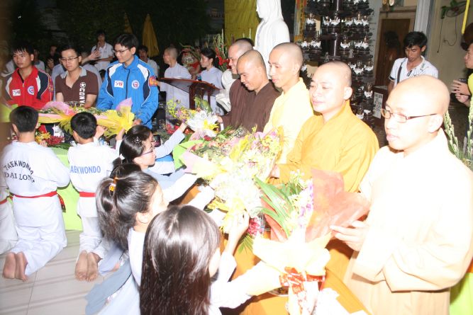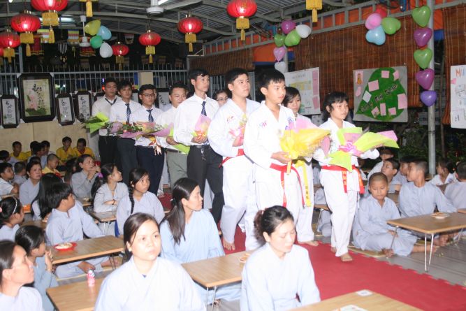 Khi lời tri ân vừa dứt, đại diện hai lớp dâng những chén trà thơm lên chư tôn thiền đức tăng ni, như tấm chân tình mà bao thế hệ học trò muốn dâng tặng. Thầy giáo Nguyễn Thanh Tùng, trưởng bộ môn võ thuật Teakwondo trong lời phát biểu của mình đã tri ân ĐĐ. Thích Quảng Tiến, người gieo những hạt giống tốt để thầy tiếp xúc với Phật pháp và có cơ hội phụng sự, giúp đở các tu sinh.