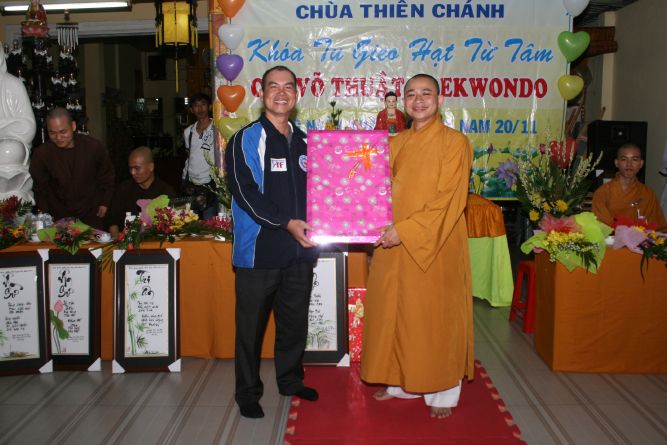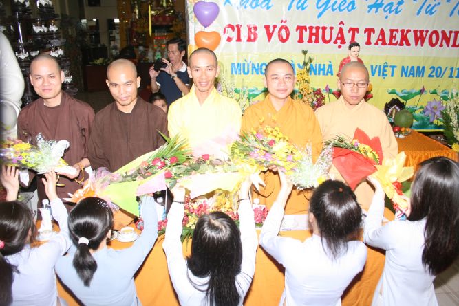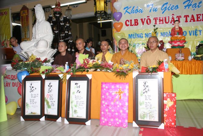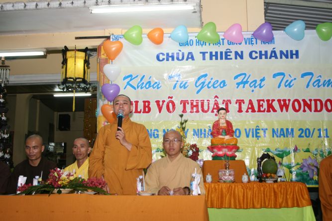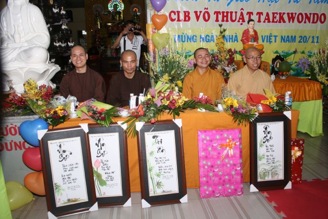 Nhân ngày 20/11, với hương lòng quyện tỏa, chúng con xin kết đóa hoa tươi thắm và những lời tri ân sâu sắc nhất kính dâng lên quý thầy, quý sư cô, các thầy trong CLB võ thuật. Xin cho chúng con được nói lời cám ơn bằng tất cả trái tim chúng con dâng lên quý Ngài, lên sư phụ Thích Quảng Tiến, chủ nhiệm khóa tu Gieo hạt từ tâm và CLB võ thuật Teakwondo chùa Thiên Chánh với tấm lòng vàng muốn xiển dương đạo Pháp, hoằng pháp độ sanh, tạo mọi điều kiện cho chúng con tham gia các lớp học đầy bổ ích, rèn luyện phẩm chất đạo đức cho chúng con. Thầy chủ nhiệm hội Khai Tâm Thích Phước Huệ và quý thầy, quý sư cô trong hội, những người đã dìu dắt chúng con từ những bài học đạo đức vỡ lòng. Một lần nữa, chúng con xin tri ân thật nhiều, những người lái đò với chiếc áo nâu đặc biệt trong cuộc đời mỗi tu sinh chúng con”.