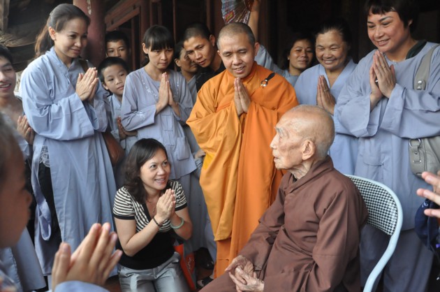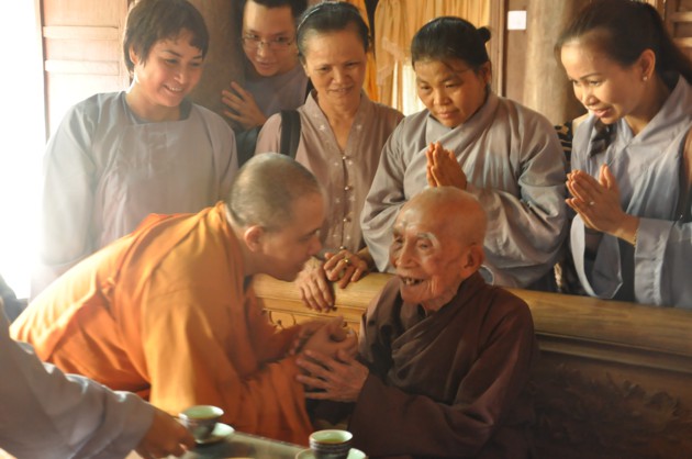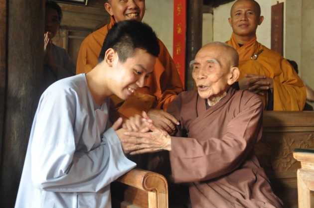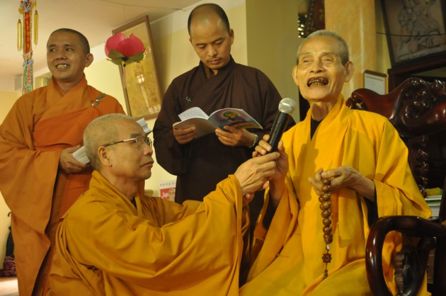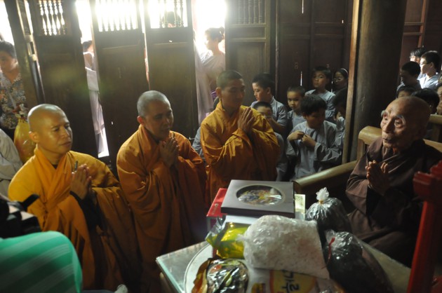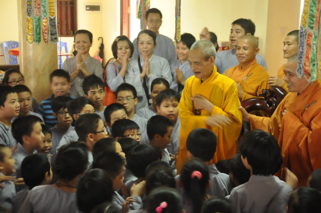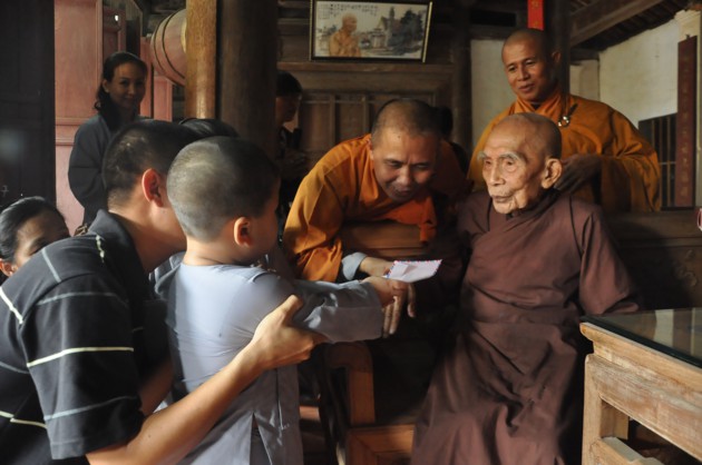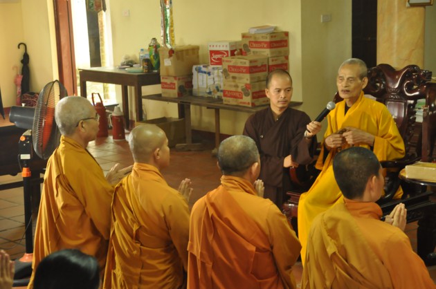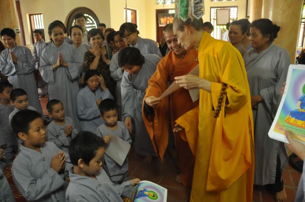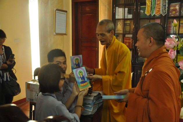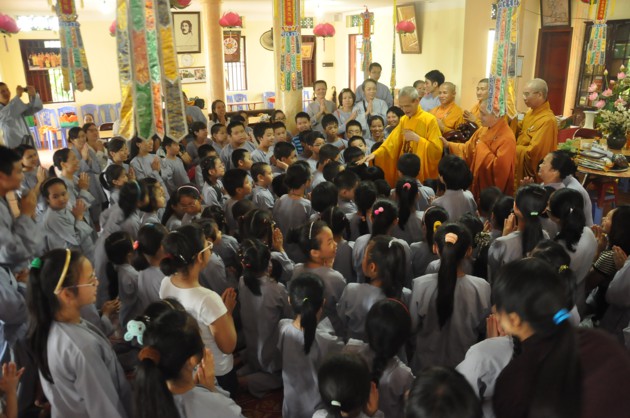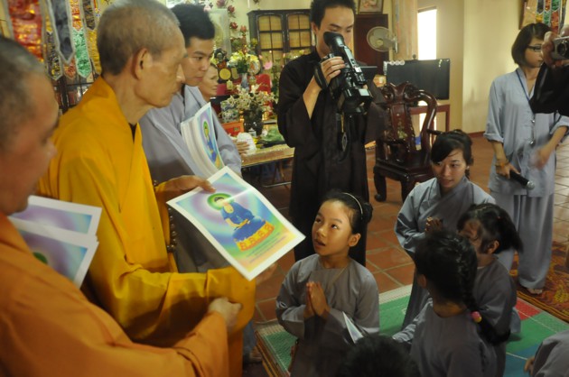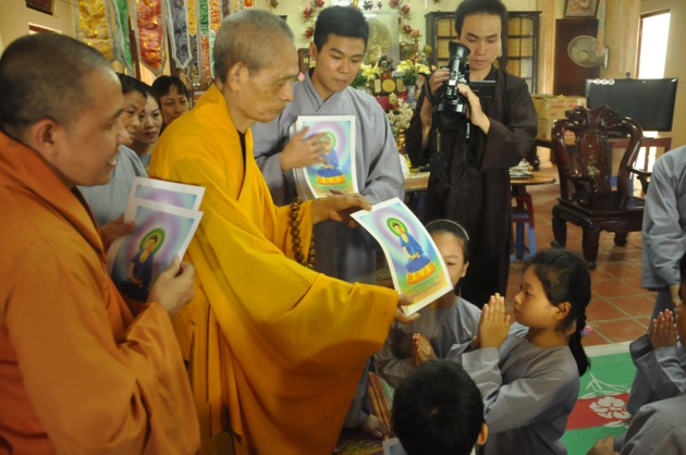 Nhân dịp các cháu về đảnh lễ, Đức Pháp chủ cũng có những món quà nhỏ là tôn ảnh của Đức Dược Sư Lưu Ly Quang Như Lai thay cho lời khích lệ tinh thần với ý nghĩa rất sâu sắc, hãy luôn chiêm bái Phật, luôn nhớ Phật cả khi đi đứng nằm ngồi, trong mọi sinh hoạt hàng ngày và nương vào đó để giải trừ tham, sân, si, cố gắng tu tập tốt hơn nữa.