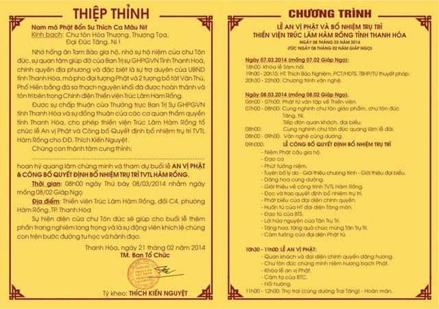 Chúng con thành tâm cung thỉnh chư Tôn đức, chúng tôi trân trọng kính mời quý Phật tử hoan hỷ quang lâm chứng minh và tham dự buổi LỄ AN VỊ PHẬT & LỄ CÔNG BỐ QUYẾT ĐỊNH BỔ NHIỆM TRỤ TRÌ TVTL HÀM RỒNG.