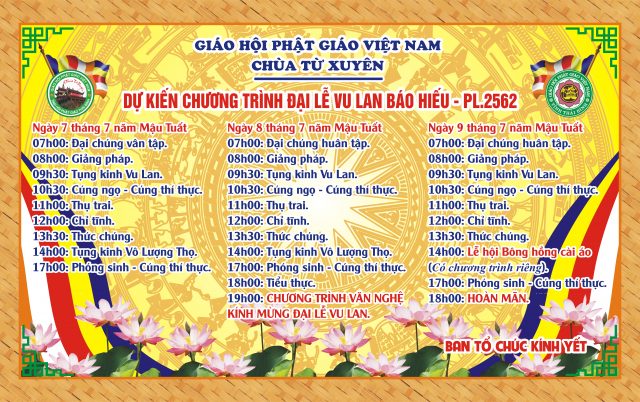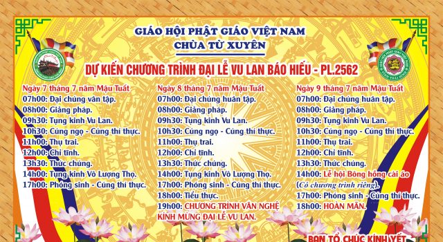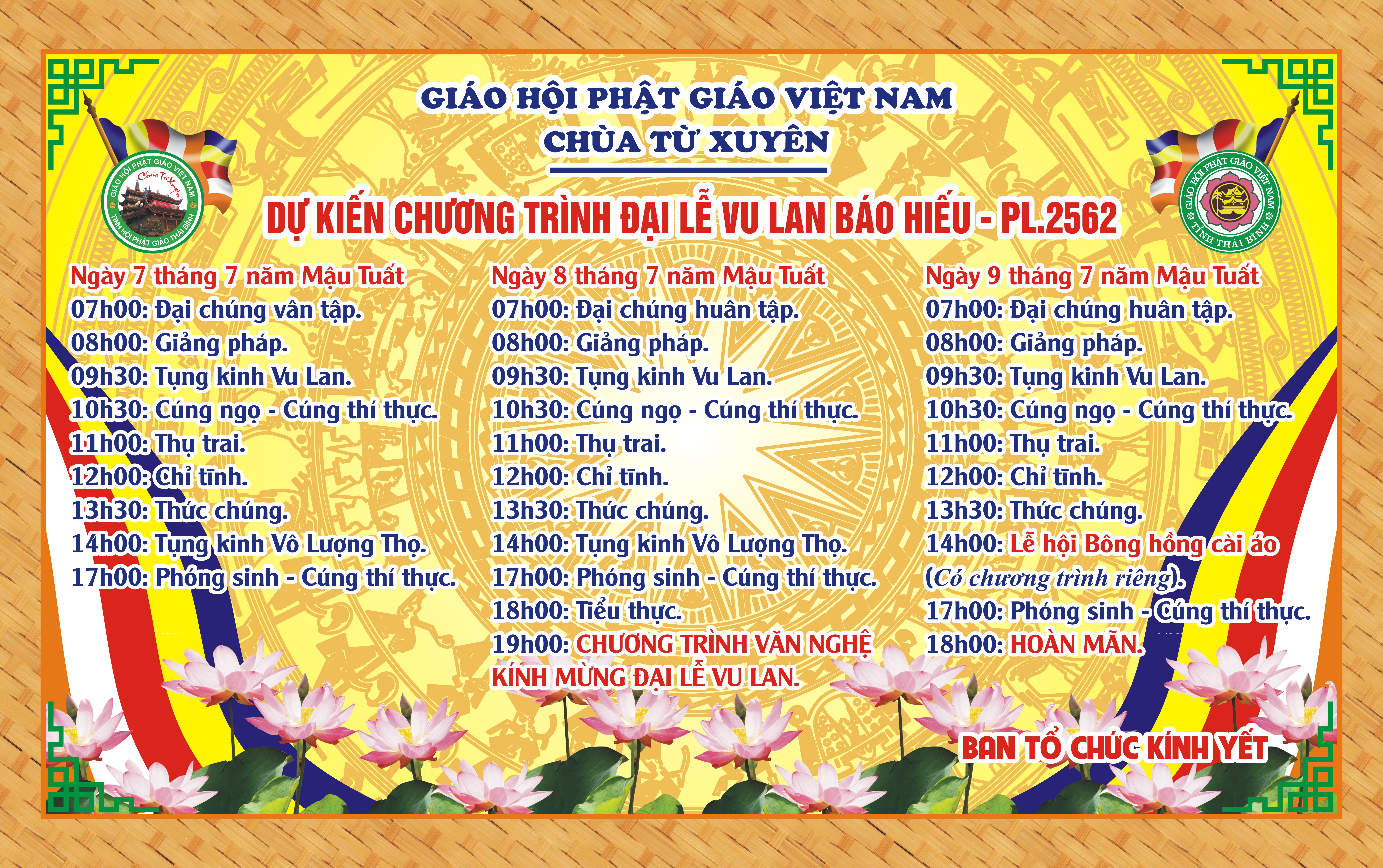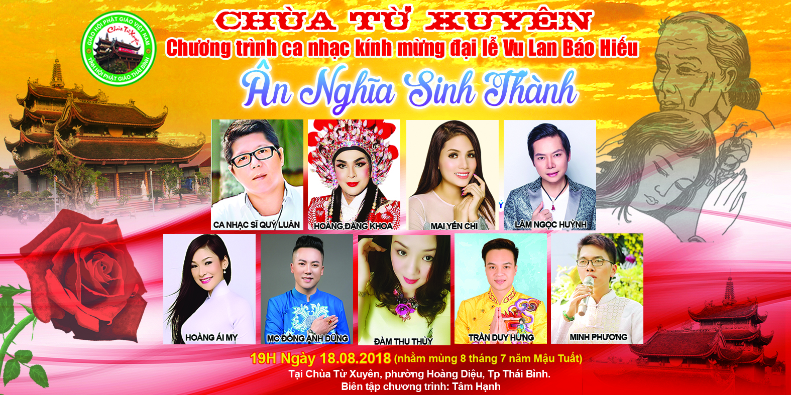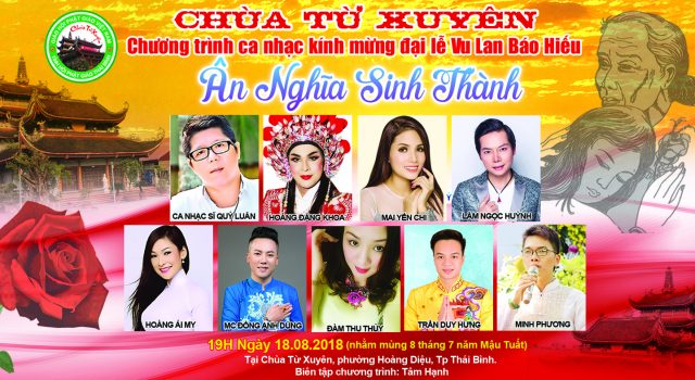 Trên tinh thần đó, chùa Từ Xuyên (P.Hoàng Diệu, TP.Thái Bình) long trọng tổ chức Đại lễ Vu Lan Báo Hiếu PL.2562 – DL.2018. Đại lễ được diễn ra trong ba ngày: 17 – 19/8/2018 (7 – 9/7/Mậu Tuất). Ban tổ chức kính mời các Phật tử, bà con nhân dân về chùa tu học, hồi hướng công đức trong mùa Vu Lan cho thất tổ cửu huyền, cha mẹ quá vãng siêu sinh Tịnh cảnh, cha mẹ hiện tiền được an vui, hạnh phúc.