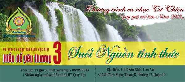 “Hiểu để yêu thương 3 – Suối nguồn tỉnh thức” sẽ là một chương trình tri ân gửi đến tất cả các vị mạnh thường quân đã đồng hành và hỗ trợ trong suốt thời gian qua, đây cũng là chương trình khép lại chủ đề “SUỐI NGUỒN TỈNH THỨC” “Hiểu để yêu thương 1 và 2 là Nụ Cười Khai Tâm” “Hiểu để yêu thương” và hẹn gặp lại vào năm 2017, chúng tôi sẽ tiếp tục quay trở lại hy vọng với sự tham gia luôn nhiệt tâm ủng hộ của quí vị chương trình của chúng tôi sẽ trở thành cầu nối tâm linh tỏa sáng trái tim những người con Việt trên mọi miền đất nước.
