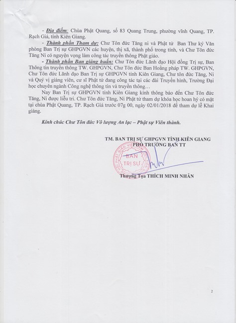 – Căn cứ Công văn số: 645/CV.HĐTS của Hội Đồng Trị Sự ngày 11/12/2017 v/v chấp thuận cho phép Ban Trị sự GHPGVN tỉnh Kiên Giang mở lớp Tập huấn truyền thông Phật giáo và Nghiệp vụ Thư ký.