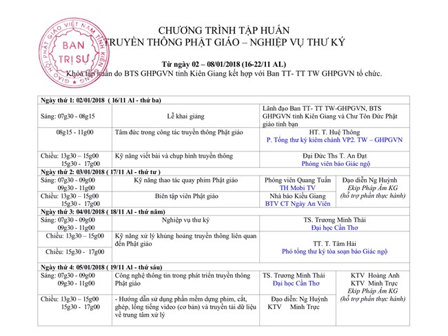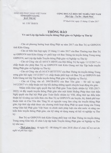 – Căn cứ Công văn số:141/CV-BTTTTTƯ của Ban Thông tin truyền thông Trung ương giáo hội ngày 14/12/2017 v/v chấp thuận phối hợp với Ban Trị sự GHPGVN tỉnh Kiên Giang mở lớp Tập huấn truyền thông Phật giáo và Nghiệp vụ Thư ký.