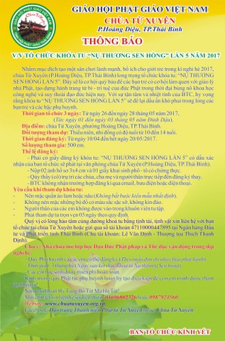 Mọi chi tiết xin liên hệ số điện thoại: 01696802326 hoặc 0987924560 và website: www.chuatuxuyen.org.vn.