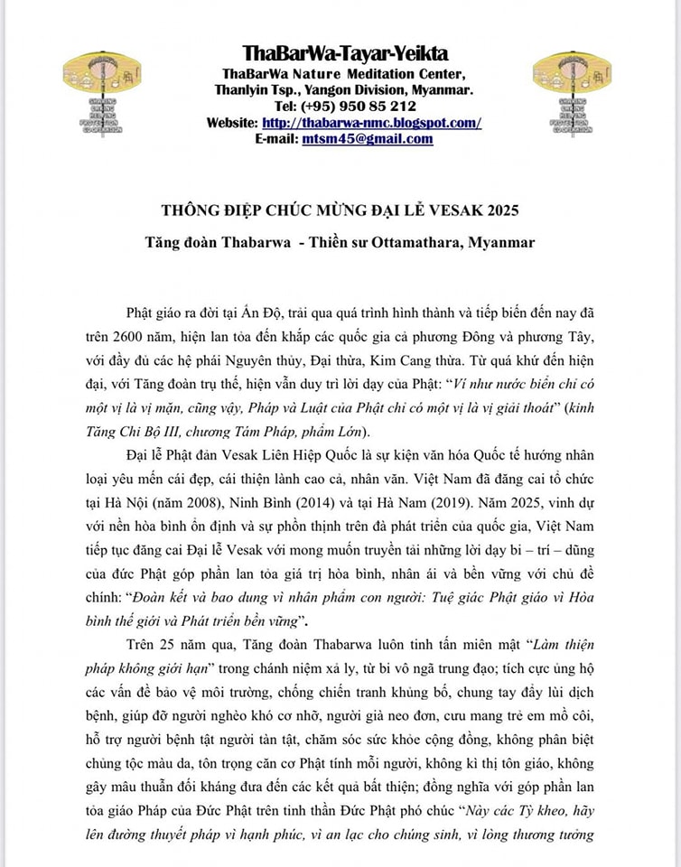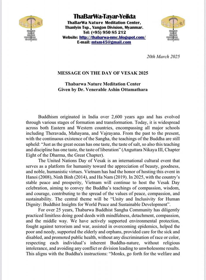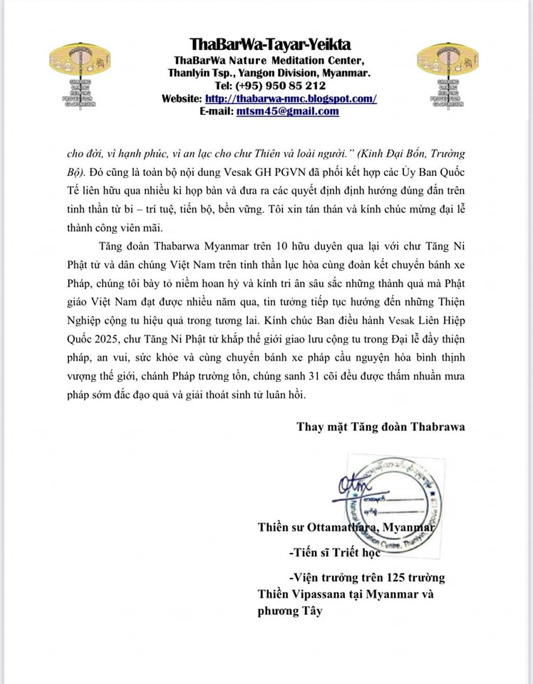 Tăng đoàn Thabarwa Myanmar trên 10 năm hữu duyên qua lại với chư Tăng Ni Phật tử và dân chúng Việt Nam trên tinh thần lục hòa cùng đoàn kết chuyển bánh xe Pháp, chúng tôi bày tỏ niềm hoan hỷ và kính tri ân sâu sắc những thành quả mà Phật giáo Việt Nam đạt được nhiều năm qua, tin tưởng tiếp tục hướng đến những Thiện Nghiệp cộng tu hiệu quả trong tương lai.