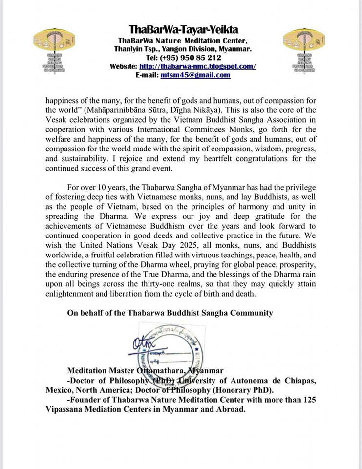 Kính chúc Ban điều hành Vesak Liên Hiệp Quốc 2025, chư Tăng Ni Phật tử khắp thế giới giao lưu cộng tu trong Đại lễ đầy thiện Pháp, an vui, sức khỏe và cùng chuyển bánh xe Pháp cầu nguyện hòa bình thịnh vượng thế giới, chánh Pháp trường tồn, chúng sanh 31 cõi đều được thấm nhuần mưa pháp sớm đắc đạo quả và giải thoát sinh tử luân hồi.