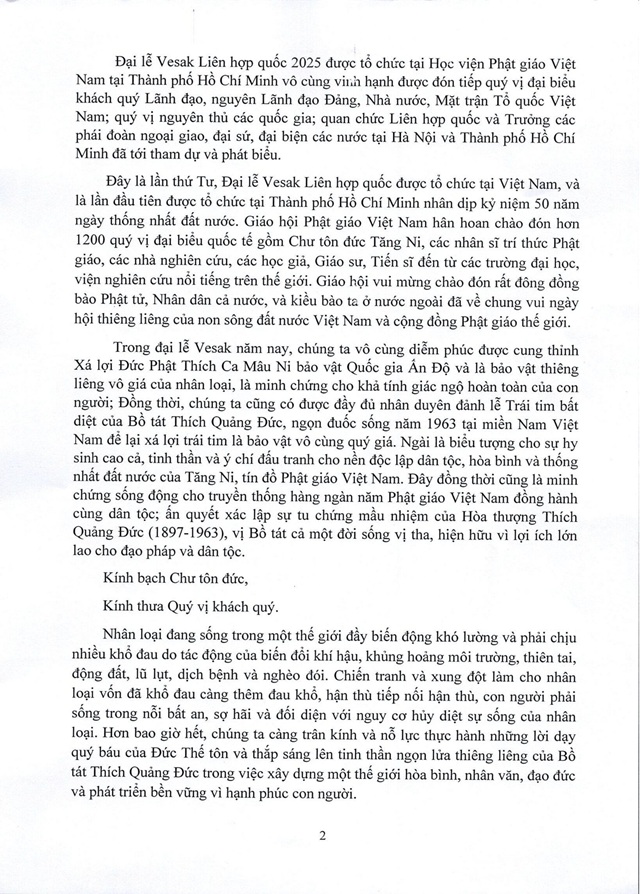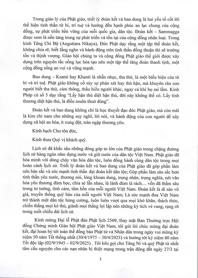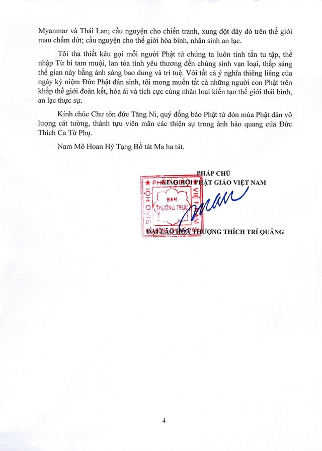 Kính mừng Vesak thiêng liêng, tôi tha thiết kêu gọi mỗi người con Phật chúng ta luôn tinh tấn tu tập, thể nhập Từ bi tam muội, lan tỏa tình yêu thương đến chúng sanh vạn loại, thắp sáng thế gian này bằng ánh sáng từ bi và trí tuệ. Với tất cả ý nghĩa thiêng liêng của ngày kỷ niệm Đức Phật đản sanh, tôi mong muốn tất cả người con Phật trên khắp thế giới đoàn kết, hòa ái và tích cực cùng nhân loại kiến tạo thế giới thái bình, an lạc thực sự.