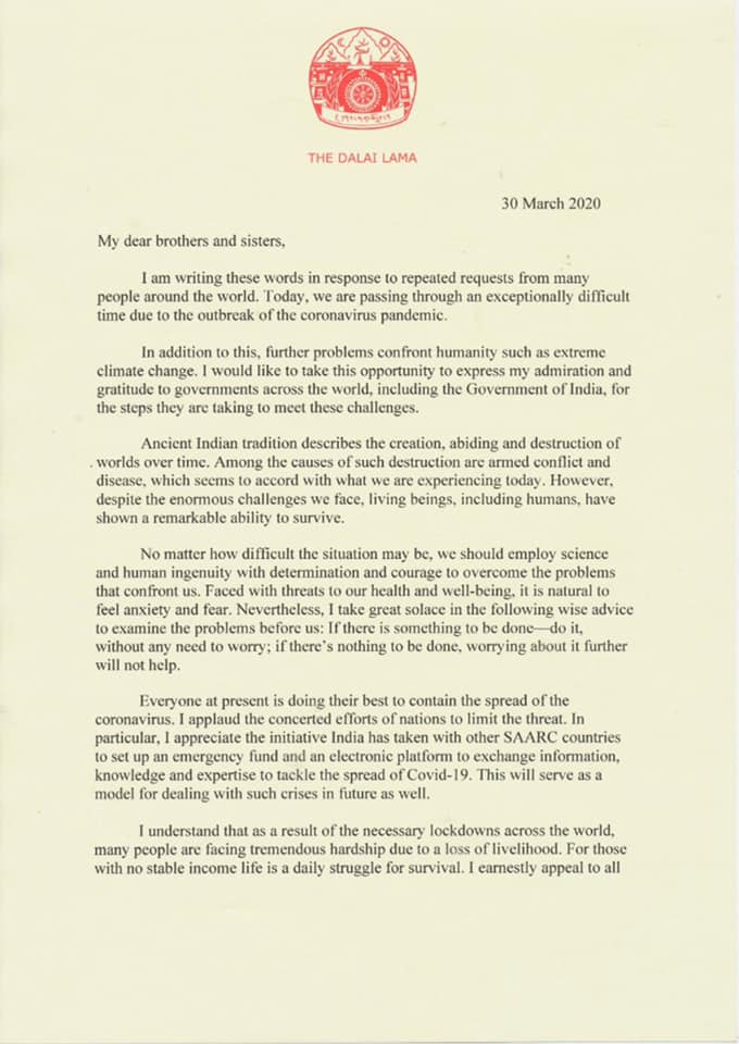 Thông điệp đặc biệt từ Thánh Đức Đạt Lai Lạt Ma về đại dịch coronavirus.