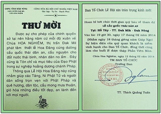 Được sự cho phép của chính quyền sở tại nên hằng năm cứ mỗi độ xuân về chùa Hoa Nghiêm thị trấn DakMil phát tâm thiết lễ hoa đăng cúng dường cầu quốc thái dân an, cầu nguyện cho đất nước thái bình, nhân dân no ấm. Đây cũng là tôn chỉ và mục tiêu của đạo Phật trong sự nghiệp hoằng dương chánh Pháp.